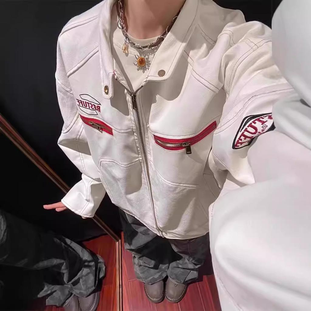 Белая короткая кожаная куртка мужская осенне-зимняя мотоциклетная куртка со стойкой воротником и вышивкой
