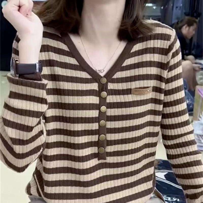 Осень Зима Полосатый Контрастный Цвет Базовый Пуловер Вязаный Новый Однорядный С Длинным Рукавом Свитер Топ