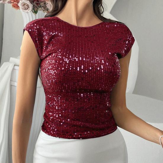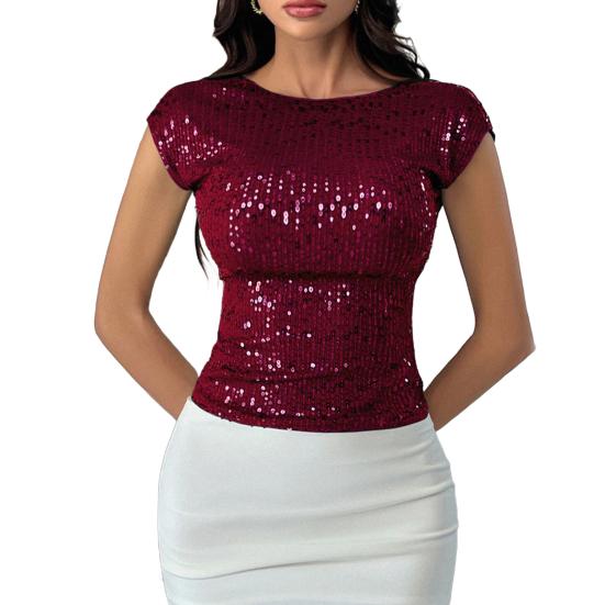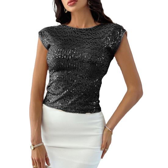 Стильная отделка пайетками: Дополните свой образ этим элегантным топом с короткими рукавами и изящной отделкой из пайеток, который без труда добавит вашему наряду нотку изысканности.