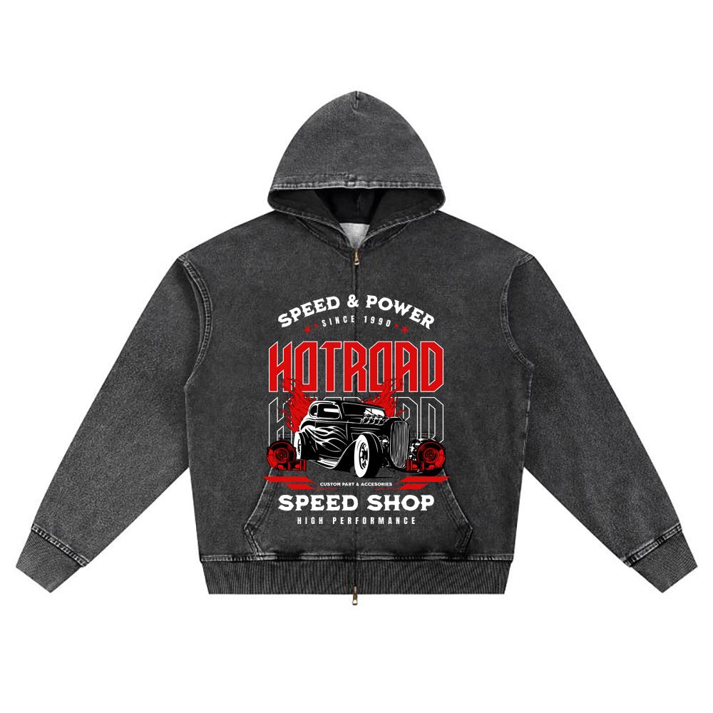 DTG print Knitted Denim Zip-Up Hoodie Hotroad Speed Shop Brother Print Zipper Hoodies
