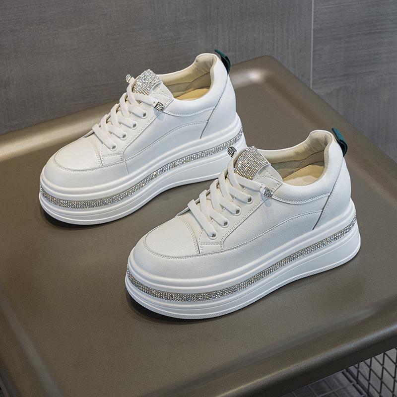 Эти стильные женские кроссовки на платформе сочетают в себе элегантность и комфорт, имеют верх из натуральной коровьей кожи и ослепительные эластичные шнурки со стразами.. Толстая полиуретановая подошва обеспечивает увеличение высоты на 7 см, гарантируя при этом легкий вес.. Эти универсальные кроссовки, разработанные с мягкой подкладкой из искусственной кожи и удобной полиуретановой стелькой, идеально подходят для любого случая, предлагая как модный стиль, так и исключительную поддержку.