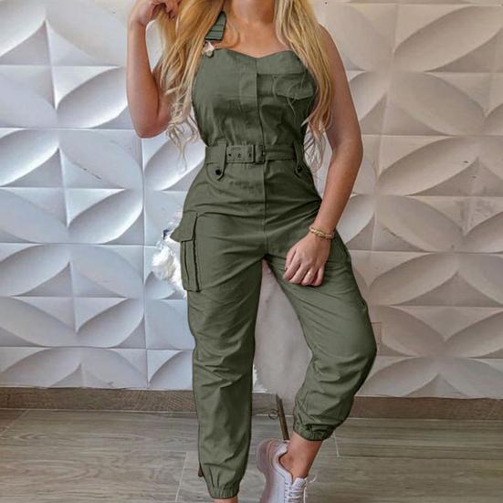 Ремень, карманы, плечевой ремень, дизайн без рукавов и дизайн комбинезона дамы, связанный по щиколотке, делают его модным и крутым.