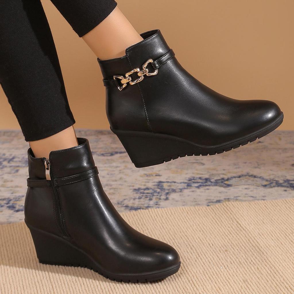 Окунитесь в стиль и комфорт с этими шикарными женскими ботильонами на танкетке, идеально подходящими для осенне-зимнего сезона 2025 года.. Изготовленные из гладкого полиуретанового верха, эти ботинки имеют модный круглый носок и привлекательную металлическую отделку, которая добавляет нотку элегантности любому наряду.. Прочная резиновая подошва обеспечивает надежное сцепление, а полиуретановая стелька обеспечивает улучшенную амортизацию для длительной носки.. Внутри подкладка из искусственной кожи обеспечивает дополнительный комфорт и тепло, что делает эти ботинки идеальными для прохладной погоды.. Благодаря удобной застежке-молнии эти ботильоны легко надевать и они обладают непринужденным стилем.. Разработанные специально для женщин, они представляют собой идеальное сочетание современного дизайна и практичности.