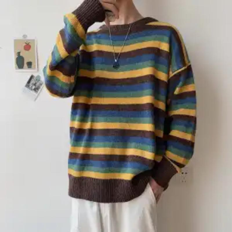 Корейские пуловеры в полоску контрастных цветов, вязаные, мужские, повседневные, свободные, осенне-зимние, с круглым вырезом, с длинным рукавом — купить товар онлайн с бесплатной доставкой по всему миру!