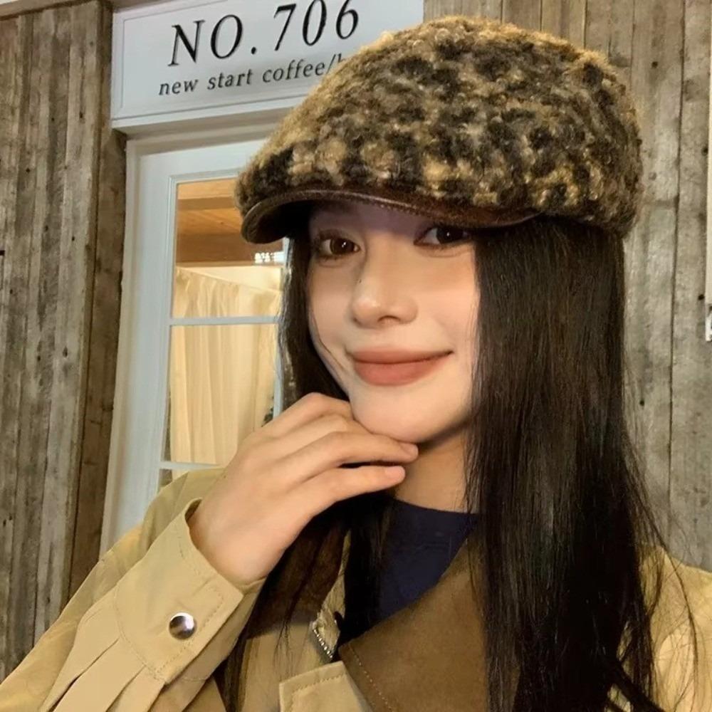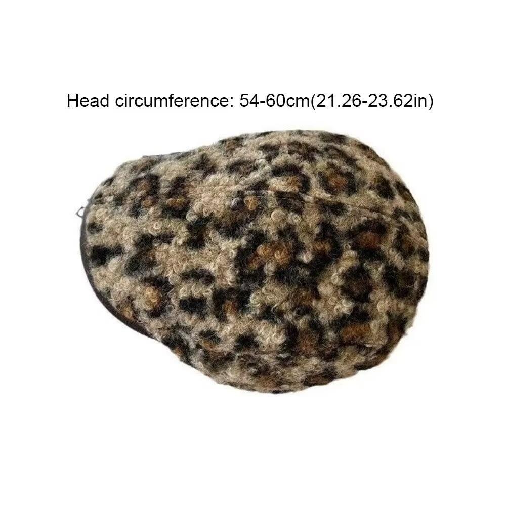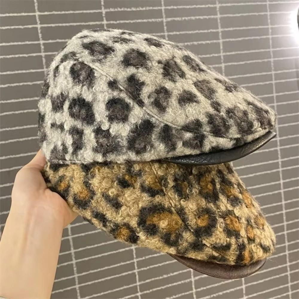 Pu Leather Brim Baseball Cap Y2K Women Leopard Print Hat Retro Lamb Wool Berets