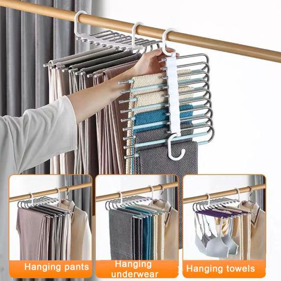 This multi-layered trouser rack offers two ways to use hang it horizontally to quadruple your wardrobe capacity, or vertically for clothes drying and sorting. It serves as a versatile storage solution for trousers, scarves, long skirts, and various clothing items, making it a must-have for dormitories.