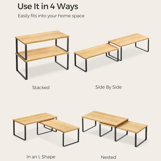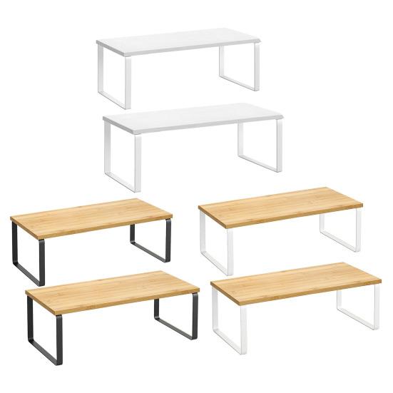 Уникальные органайзеры для полок, один из которых немного меньше другого, что позволяет складывать полки стопками, вкладывать их друг в друга или использовать по отдельности, чтобы идеально вписать их в пространство кухни.