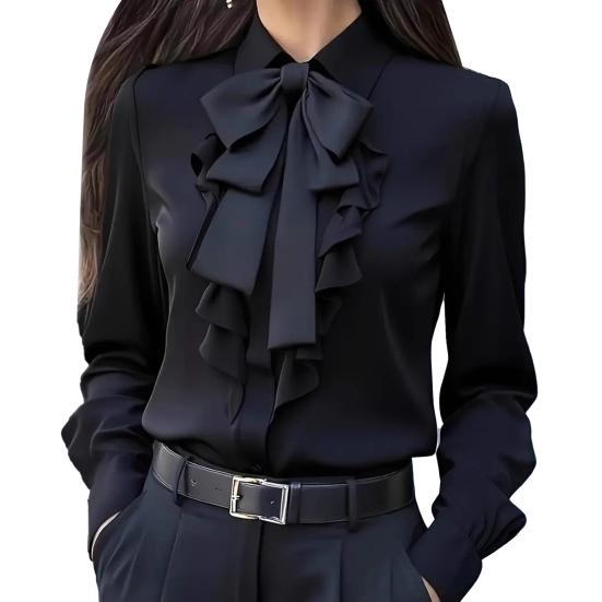 Элегантный бант на вырезе горловины добавляет нотку изысканности, а романтичный дизайн с оборками на корпусе излучает женственность и многослойность..