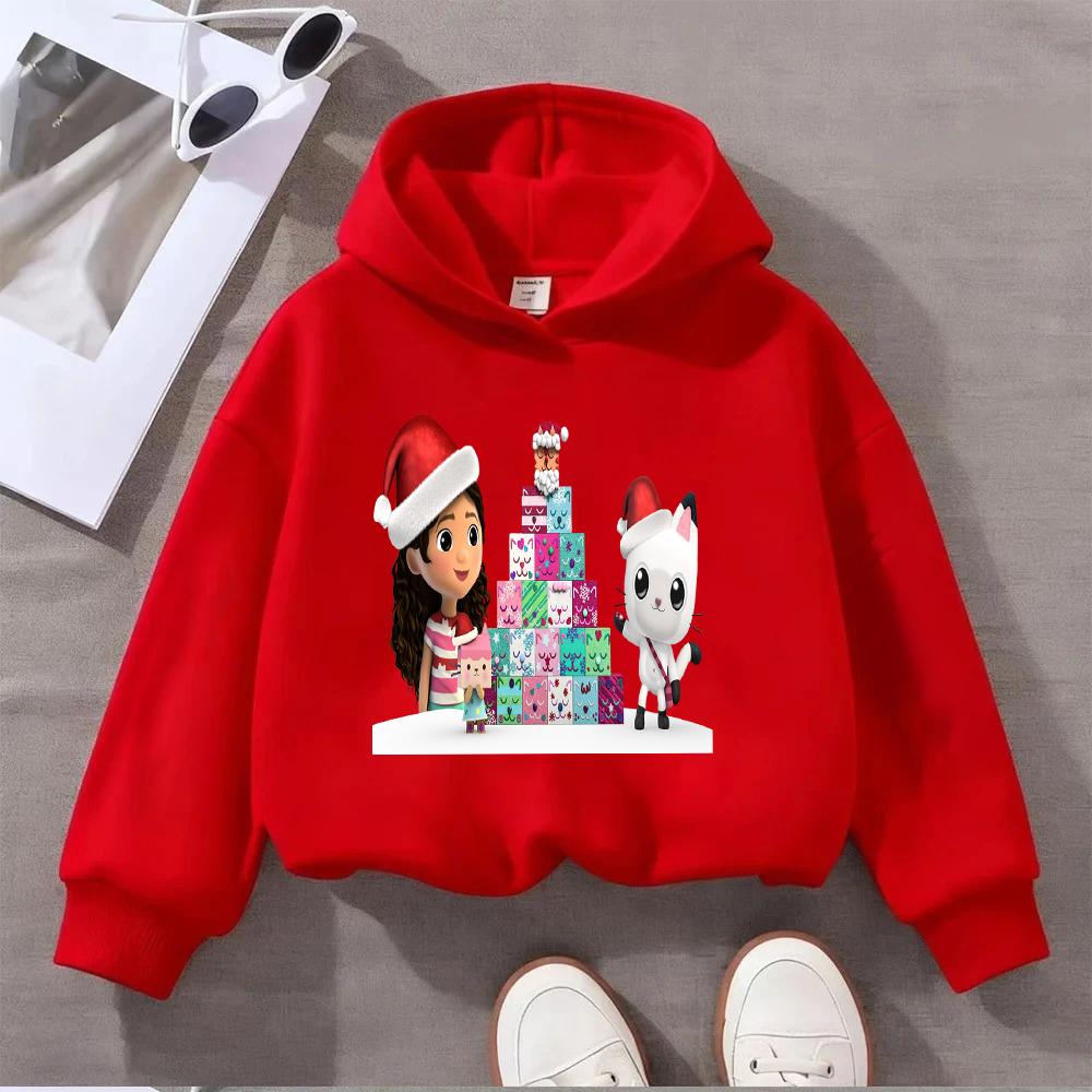 Осенняя Зимняя Детская Худи с Мультяшным Персонажем Рождественская Тема Девочка-Кошка Принт Удобная Теплая Худи для Девочки