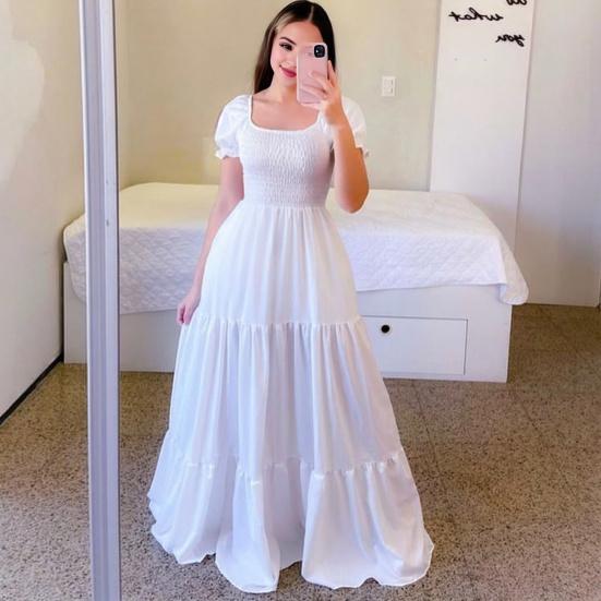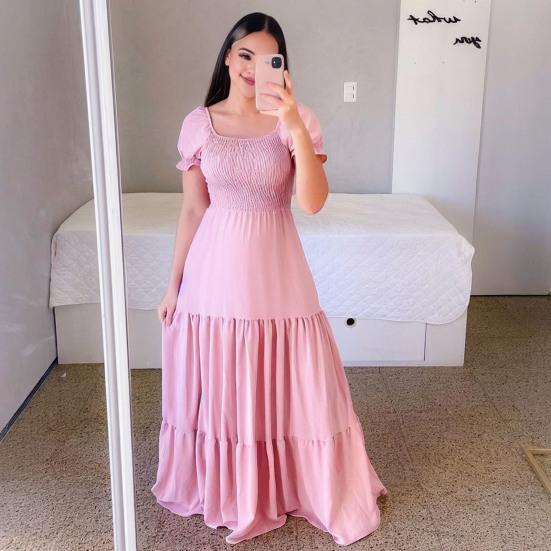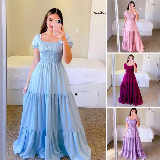 Характеристики: Основные особенности платья включают квадратный вырез, открытые плечи, плиссировку, А-силуэт, свободный лоскутный подол, однотонный цвет и дизайн длиной в пол..