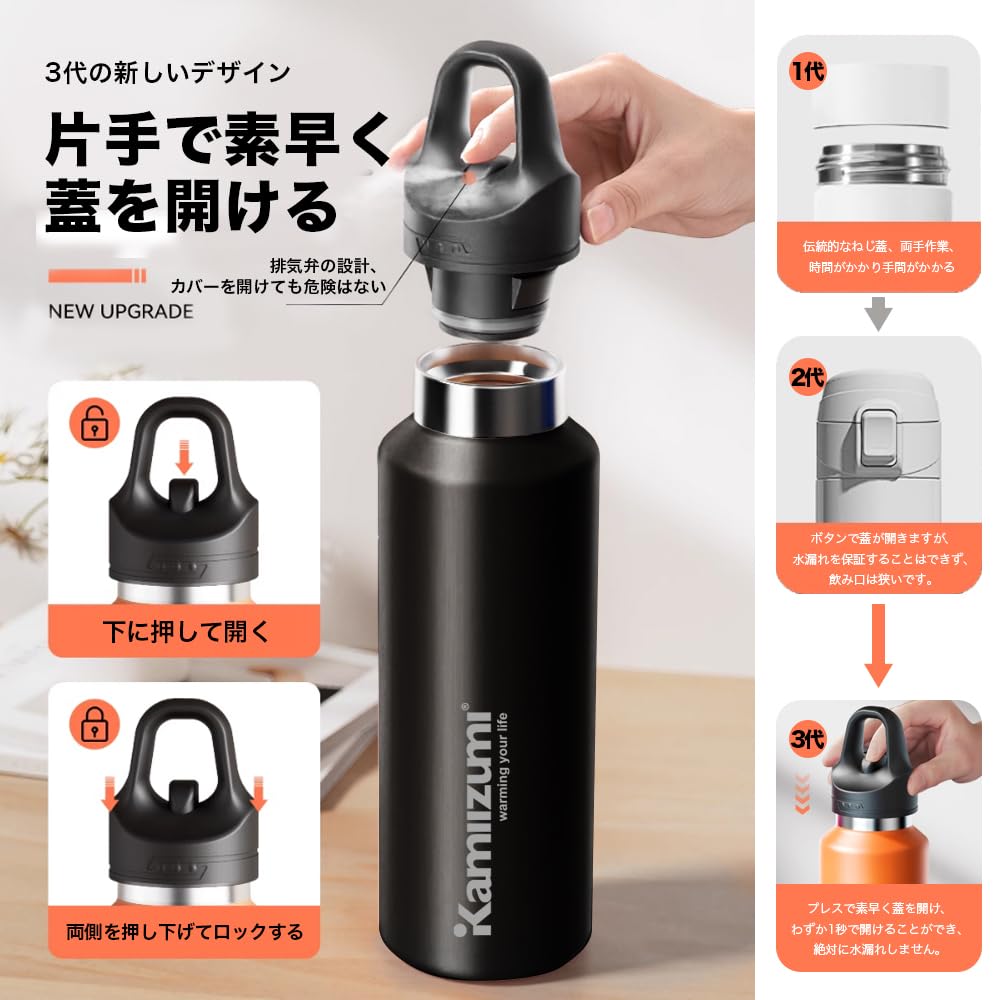 Kamiizumi Stainless Steel Water Bottle, 900ml640ml, [One-Hand Automatic Switch, Leak-Proof], Vacuum Insulated, Keeps Hot or Cold, Portable, Large