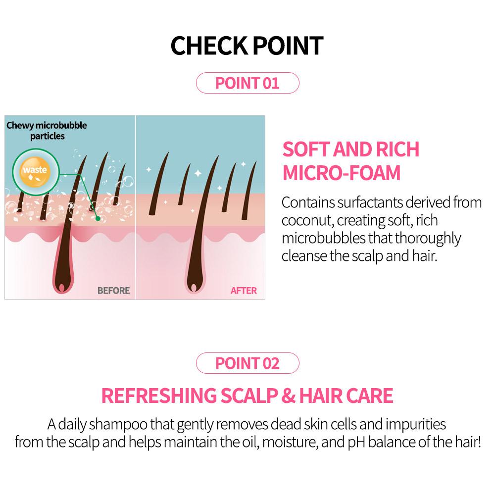Мягкие, насыщенные микропузырьки тщательно очищают кожу головы и волосы.