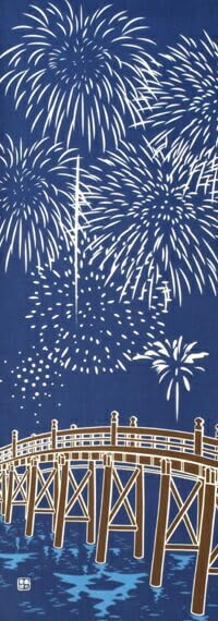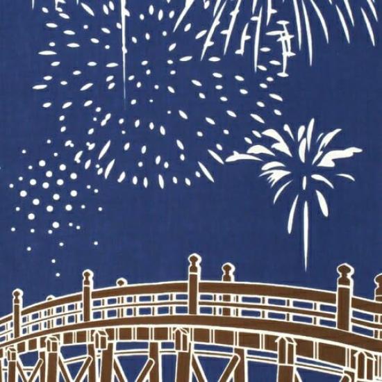 The design depicts fireworks seen over a bridge, the night sky, and the cool surface of the water. The fireworks are gorgeous, yet have a chic and emotional atmosphere. Colorful fireworks are mainstream these days, but it is said that color was first introduced to fireworks during the Meiji period. Enjoy this nostalgic design that makes you feel like you can hear the sounds of summer.