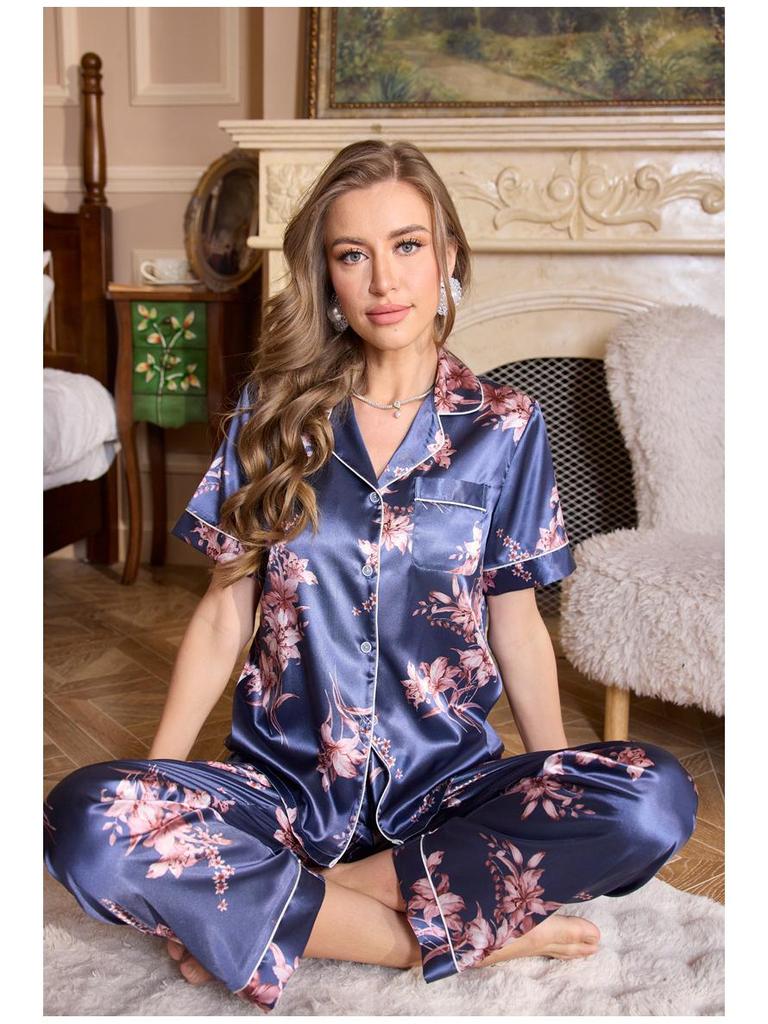 Откройте для себя максимальный комфорт и стиль с этим женским летним пижамным комплектом, состоящим из футболки с короткими рукавами и длинных брюк.. Этот повседневный домашний костюм, выполненный с модным лацканом и шикарным принтом, идеально подходит для расслабленных вечеров и спокойных ночей.. Изготовленный из роскошного шелкового материала, он дарит мягкое, дышащее ощущение на коже, обеспечивая прохладу и комфорт в течение всего лета.