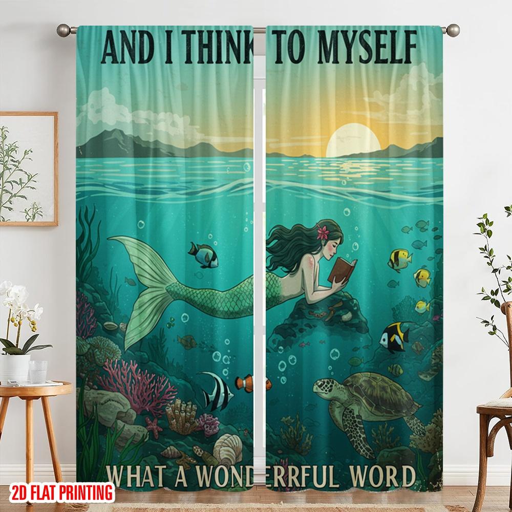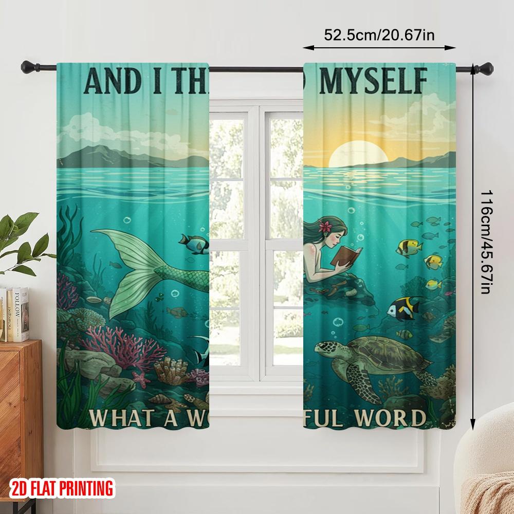 2pcs 2D flat printing Curtain Mermaid Reading Wonderful Ocean Polyester Fabric Without Electricity Festive Holiday Use for
