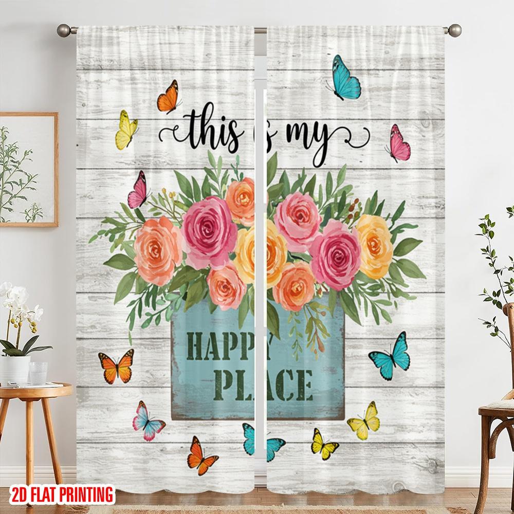 2pcs 2D flat printing Curtain Floral Butterflies Happy Place Sign Polyester Without Electricity Festive Curtains Perfect for