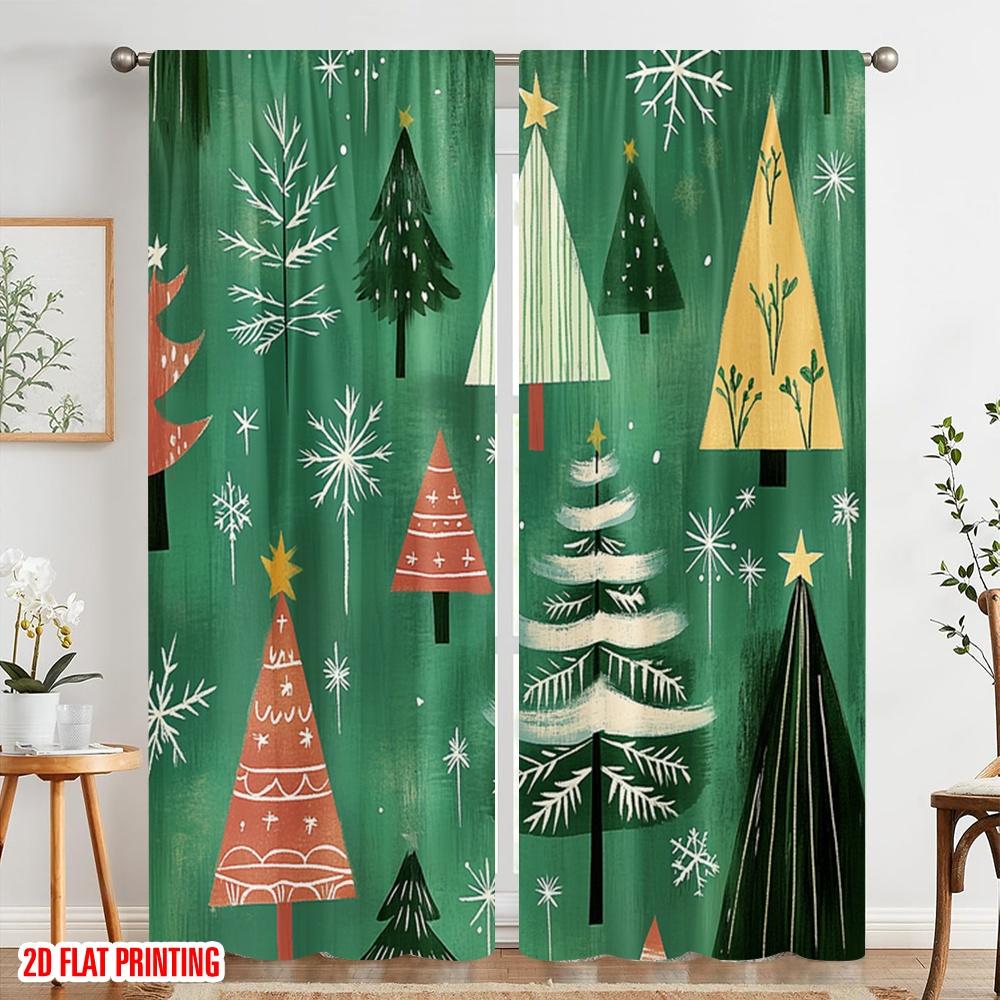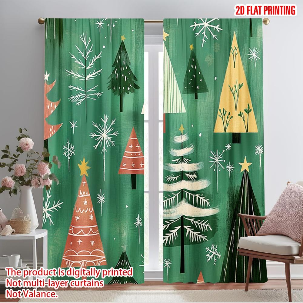 2pcs,2D plane printing Curtain Popular Festive Green Christmas Trees Snowflakes Polyester Woven (without rod) Decorations