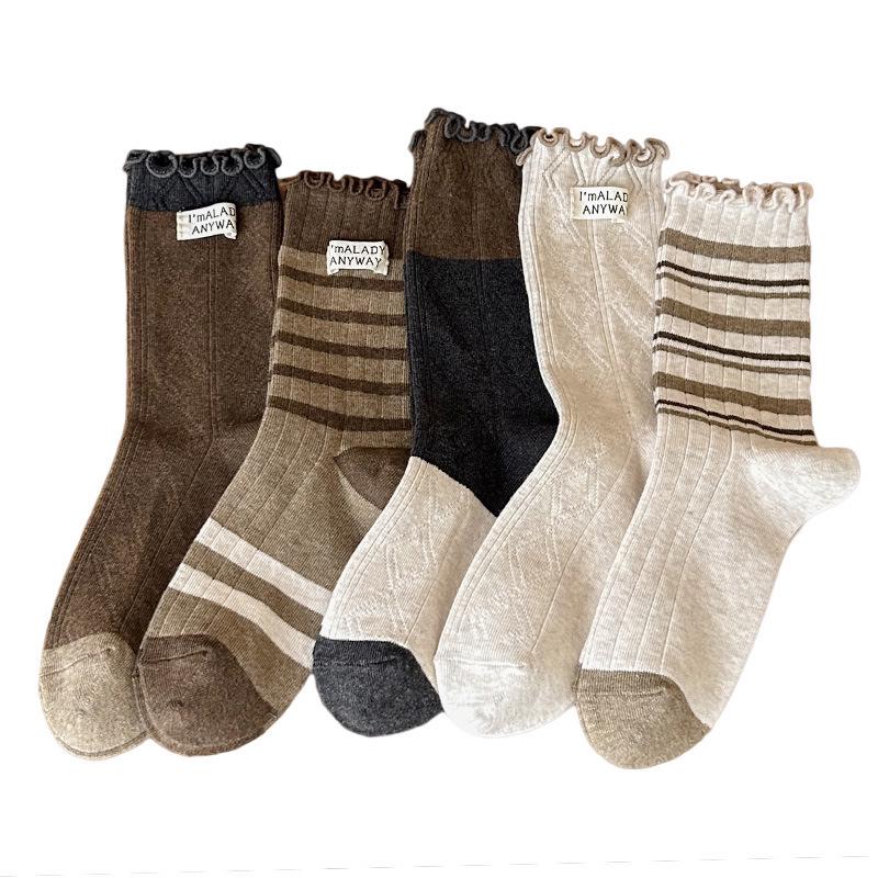 Женские носки до середины икры в стиле ретро с полосками на осень/зиму - гребенной хлопок с оборкой.