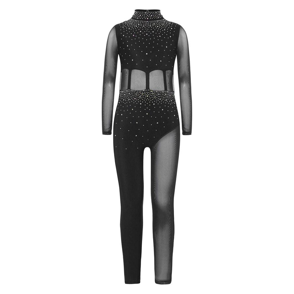 Комбинезон для танцевальных выступлений для девочек, боди с длинным рукавом и воротником-стойкой, сетчатые вставки, вырез-капелька на спине