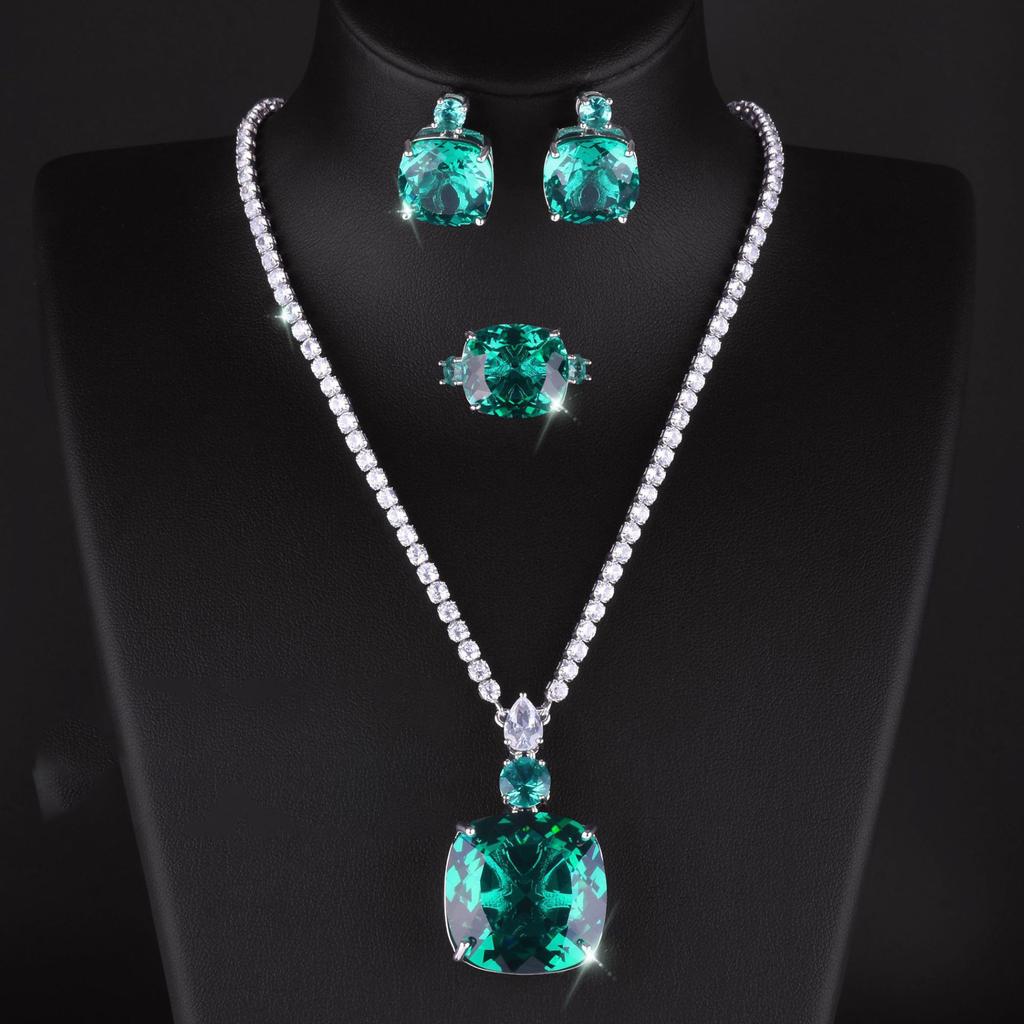 Имитация Параиба Зеленый Бриллиант Набор Ожерелье Цепочка Роскошный Полный Бриллиант Красный Камень Ужин Свадьба Серьги-гвоздики Кольцо Женщины