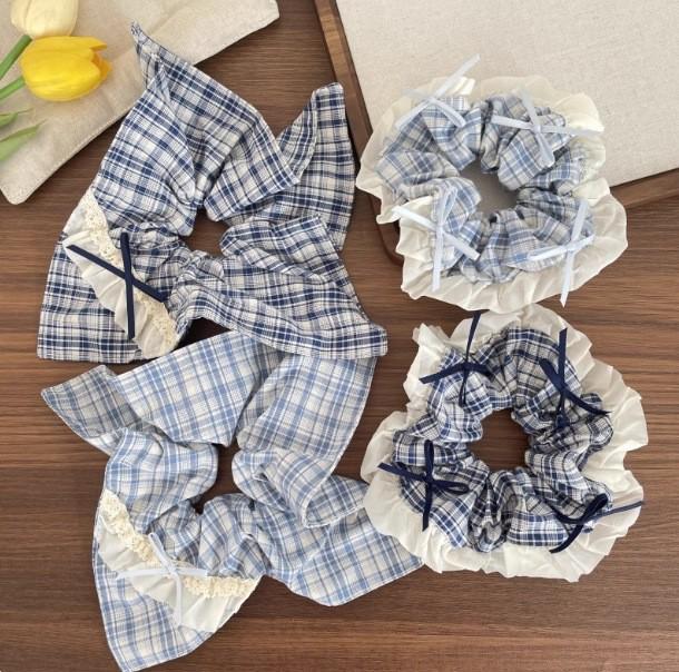 Корейский синий клетчатый шарф-бант женский набор резинок для волос и повязки на голову