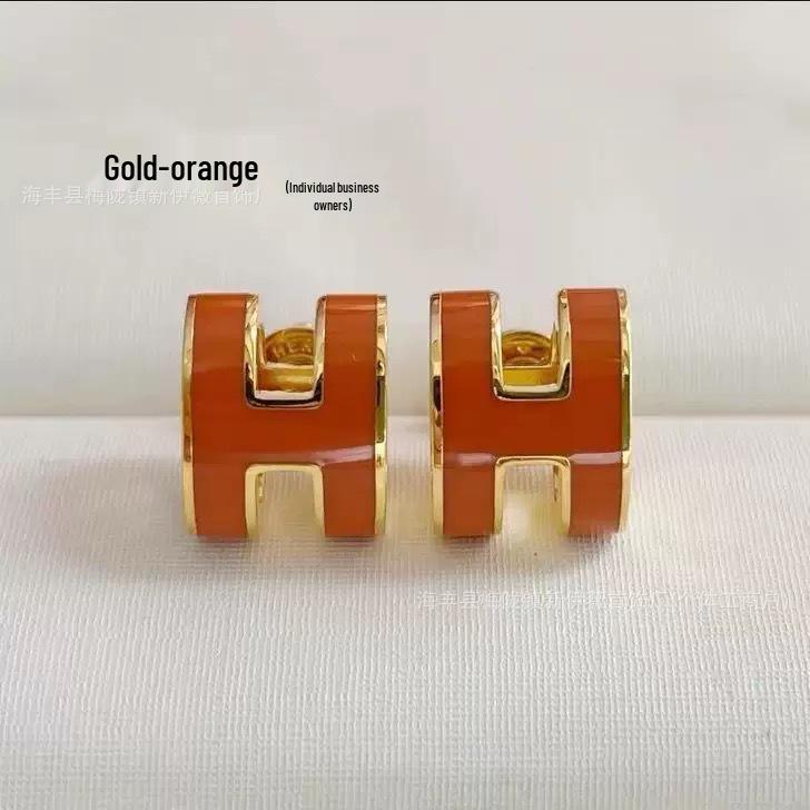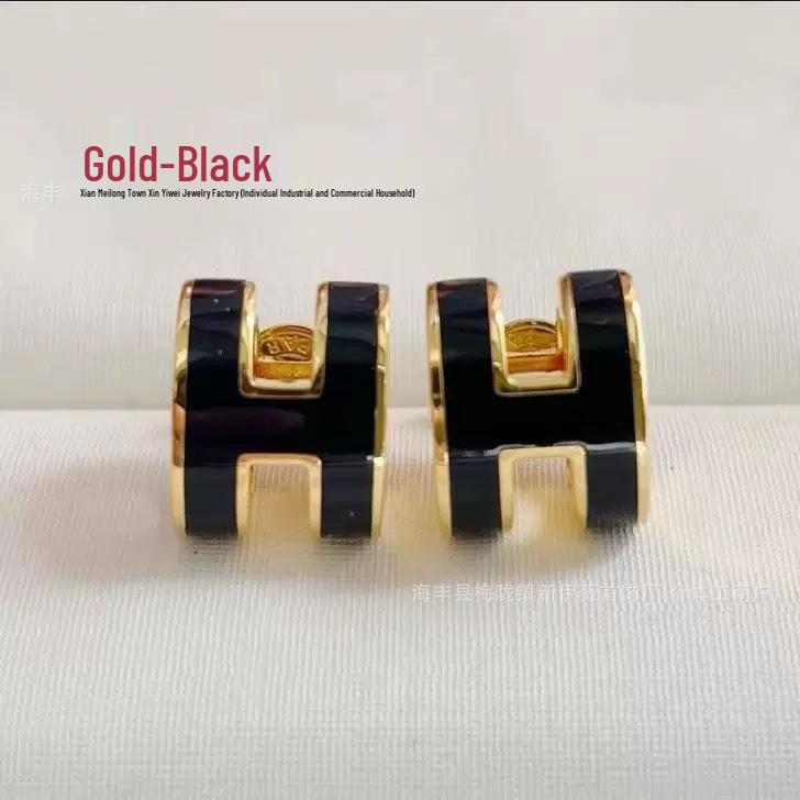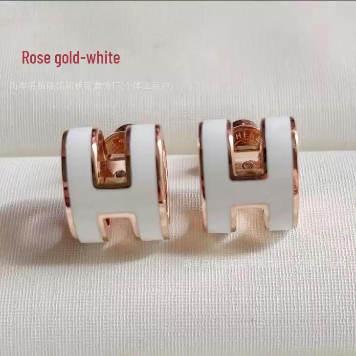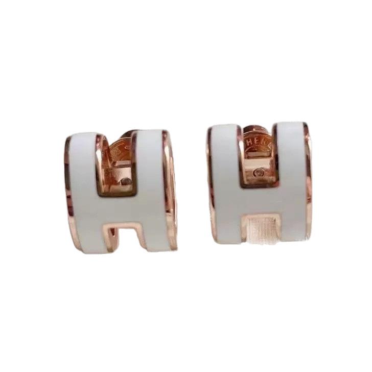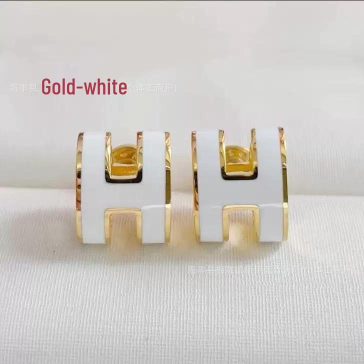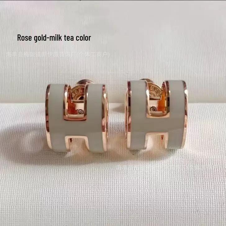 Gold H Letter Enamel Stud Earrings, 18k Thick Plated, White Milk Tea Color, Women’s Fashion Jewelry.
