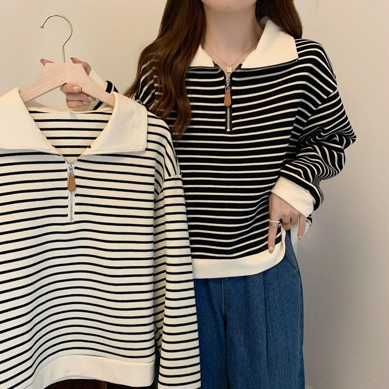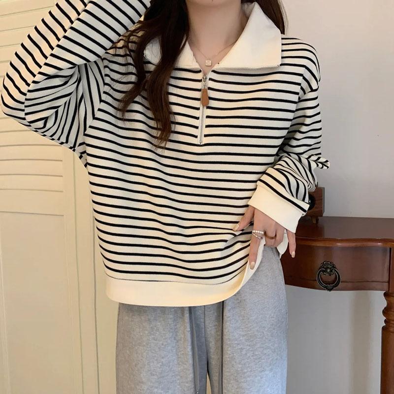 Топ женский осенний полосатый пуловер с половиной молнии с v-образным вырезом и длинными рукавами, свитер, свободные повседневные универсальные топы