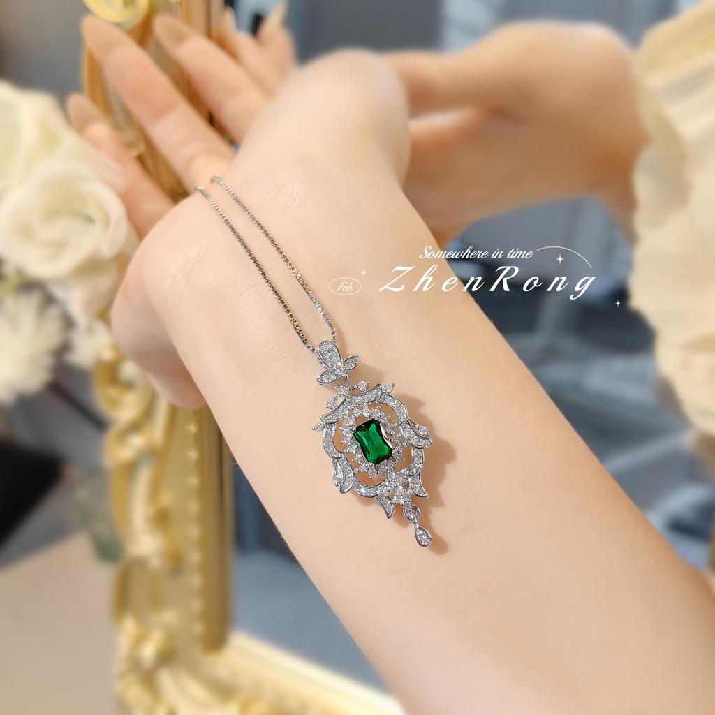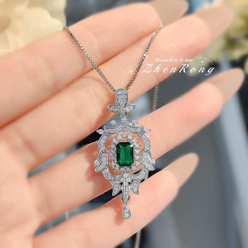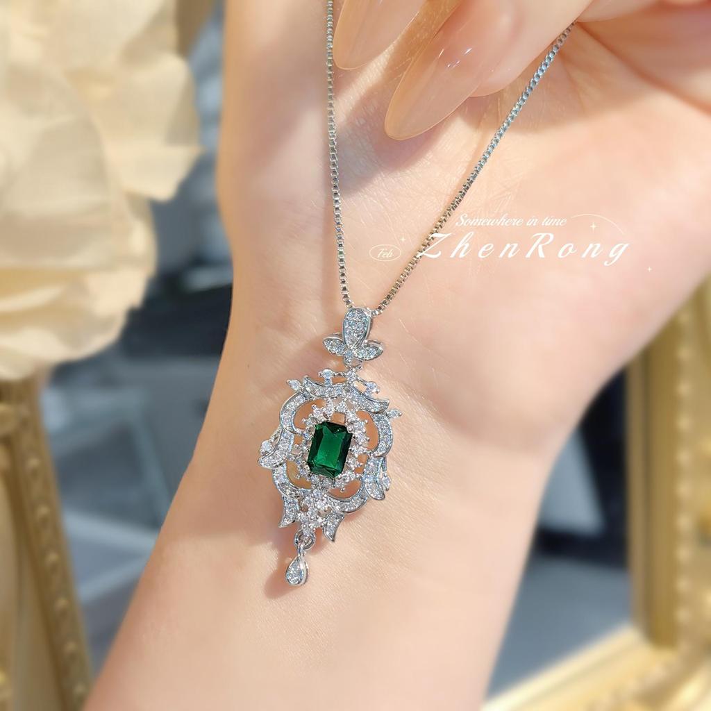 Винтажное колье-подвеска с изумрудом огранки «принцесса» и цирконом для женщин