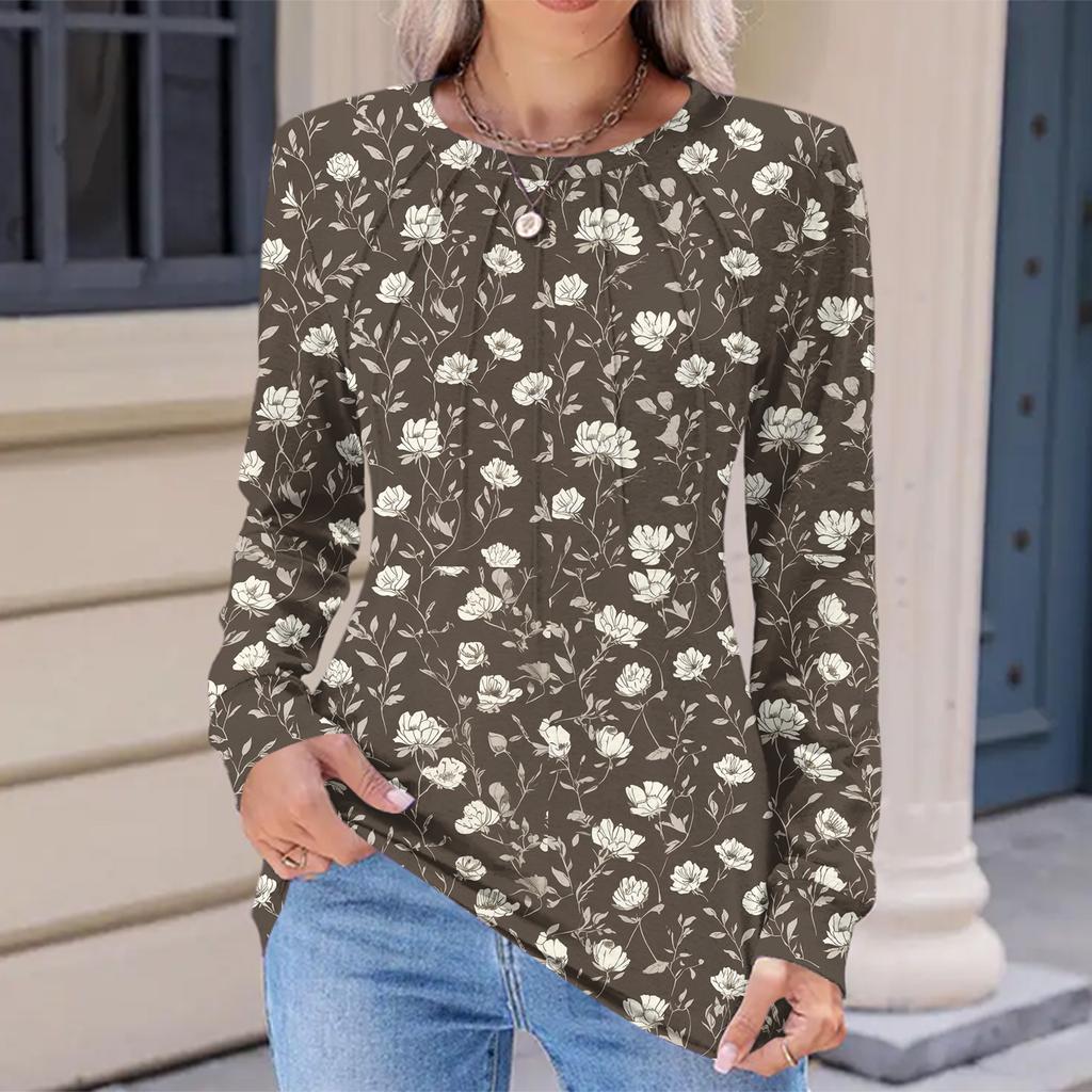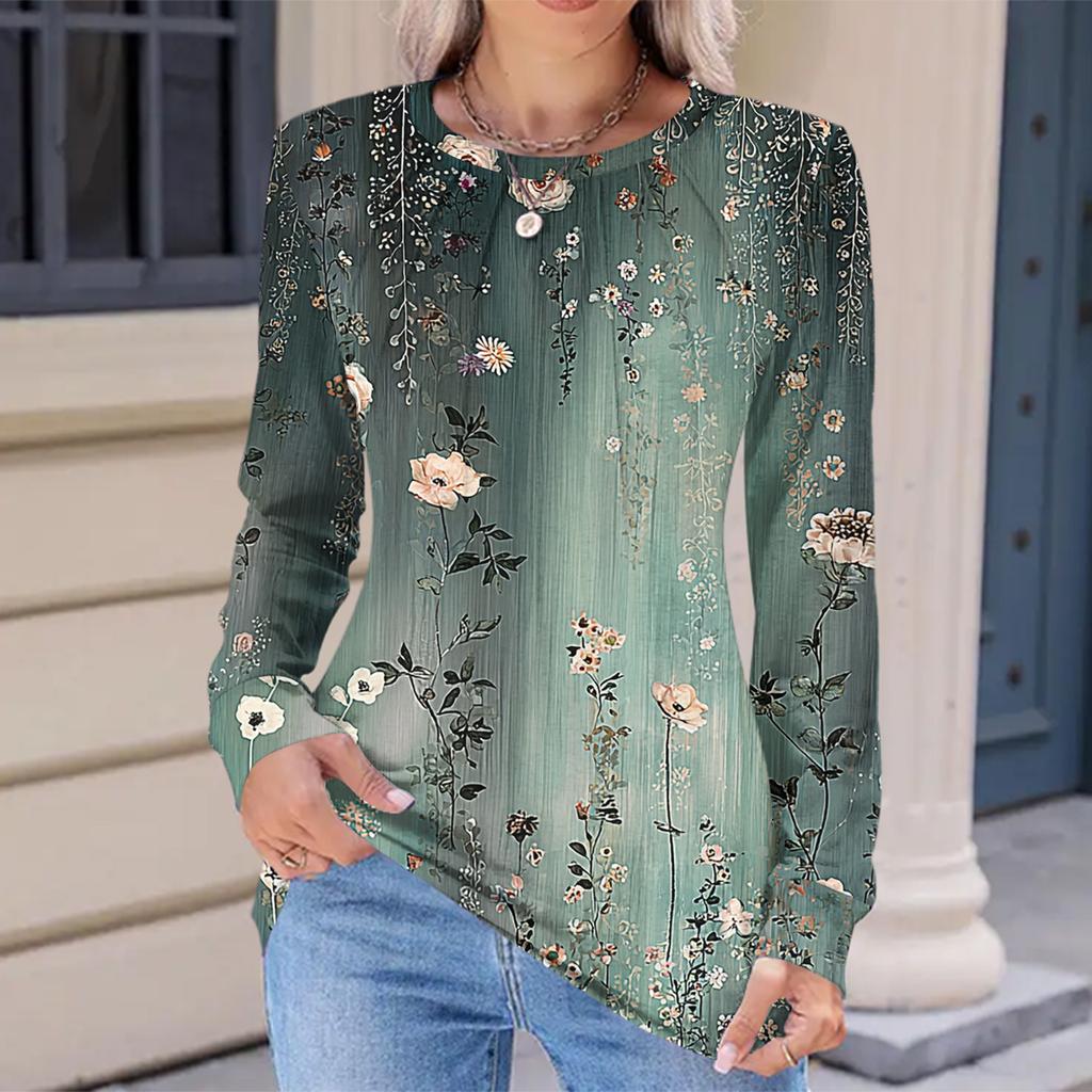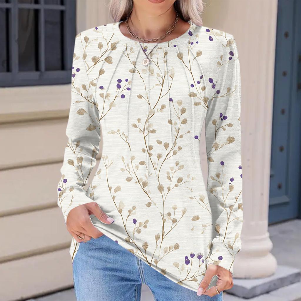 Женская модная повседневная футболка с цветочным ретро-принтом, плиссированная, удобная, с круглым вырезом, свободная, с длинным рукавом