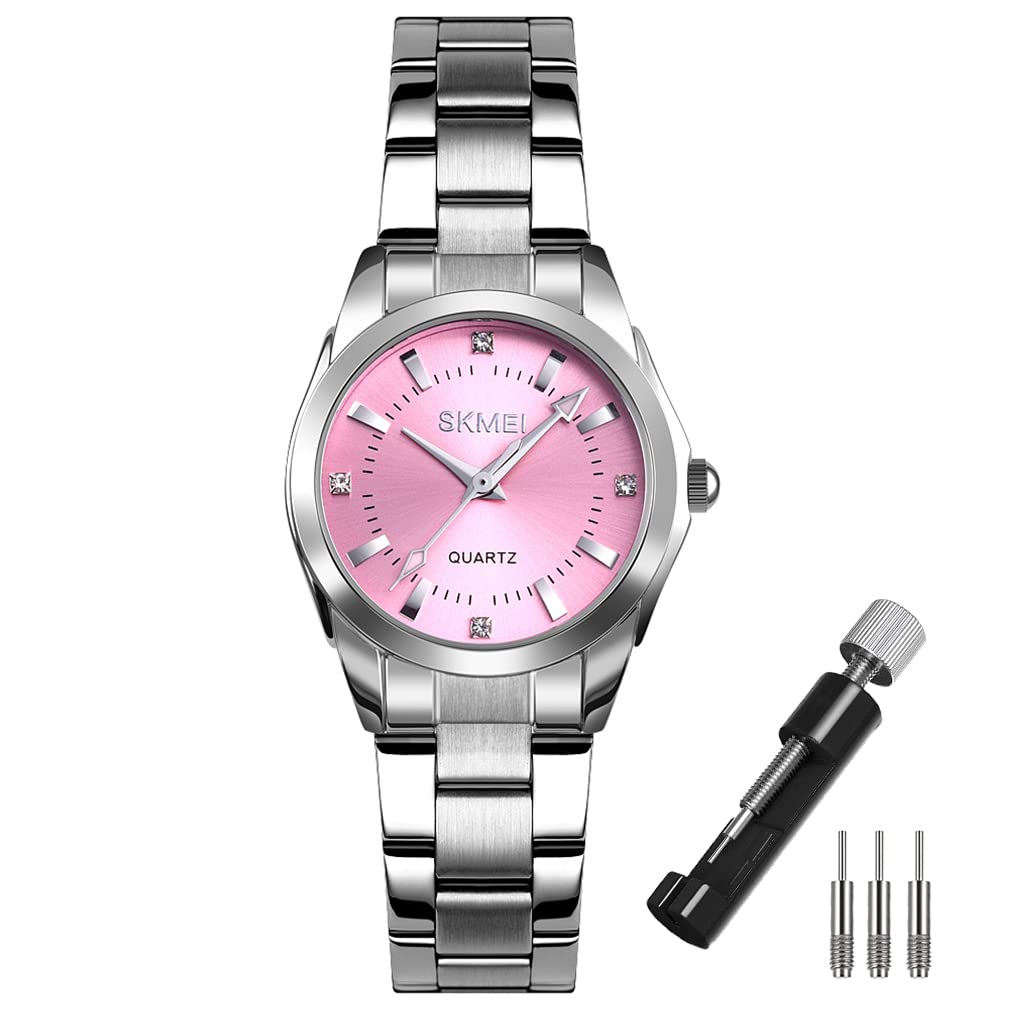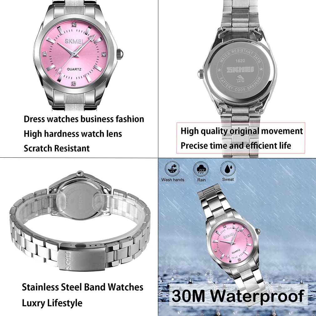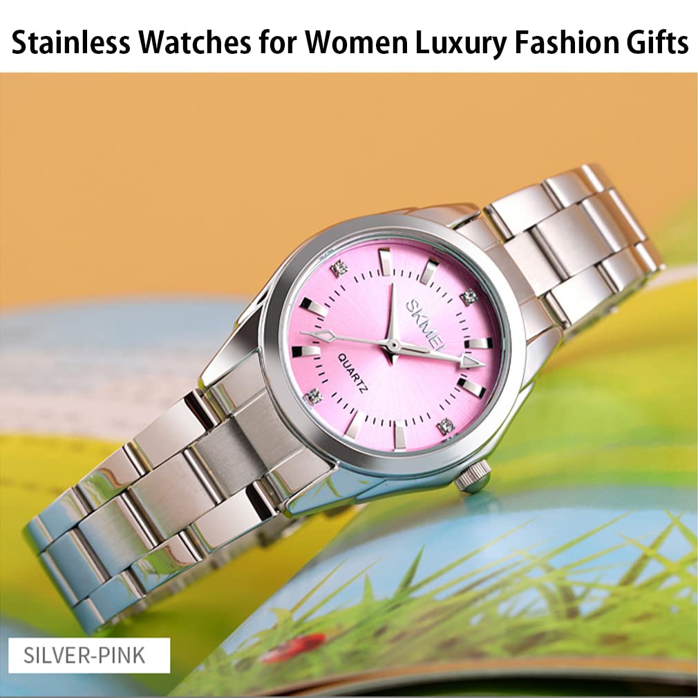 SKMEI Женские Модные Классические Часы для Бизнеса: Изысканно спроектированный и надежно установленный. Элегантный дизайн циферблата и изысканное часовое мастерство обеспечат вам самые идеальные ощущения от ношения.. Носите эти часы для бизнеса, отдыха и повседневного использования, в помещении и на открытом воздухе, они идеально подходят для вас и ваших друзей. Эти роскошные наручные часы доставляются быстро компанией Amazon и идеально доставляются по указанному вами адресу.. Женские часы из золота, серебра и нержавеющей стали. люкс: Высококачественный кварцевый механизм обеспечивает точный ход времени, а аналоговый циферблат делает его идеальным подарком или личным аксессуаром для любого случая.. Эти водонепроницаемые женские часы из нержавеющей стали оснащены высококачественным антибликовым циферблатным стеклом с прочным покрытием для предотвращения царапин и поломок.. Эти популярные, доступные женские кварцевые аналоговые круглые часы водонепроницаемы до 30 м, подходят для мытья рук, плавания и повседневного использования.. Не подходит для подводных занятий. уведомление: Не нажимайте кнопки под водой.. Не подходит для купания и плавания.