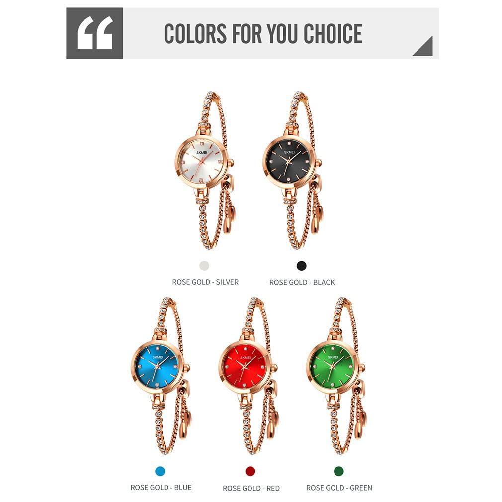 Женские браслетные часы SKMEI: Изысканно спроектированный и надежно установленный. Элегантный дизайн циферблата в сочетании с изысканным часовым мастерством дарит вам самые идеальные ощущения от ношения.. Носите эти часы для бизнеса, отдыха и повседневного использования, в помещении и на открытом воздухе, и они идеально подходят для вас и ваших друзей.. Эти роскошные женские часы доставляются быстро компанией Amazon и идеально доставляются по указанному вами адресу.. Женские часы доступны в красном, зеленом, синем, белом и черном цветах.. Его японский кварцевый механизм точно показывает время, а аналоговый циферблат делает его идеальным подарком или личным аксессуаром для любого случая.. Эти водонепроницаемые женские часы из нержавеющей стали оснащены высококачественным, антибликовым, прочным покрытием циферблатного стекла для предотвращения царапин и поломок.. Эти женские браслетные кварцевые аналоговые модные повседневные круглые часы водонепроницаемы до 30 м, подходят для мытья рук, плавания и повседневного использования.. Не подходит для подводных занятий. уведомление: Не нажимайте кнопки под водой.