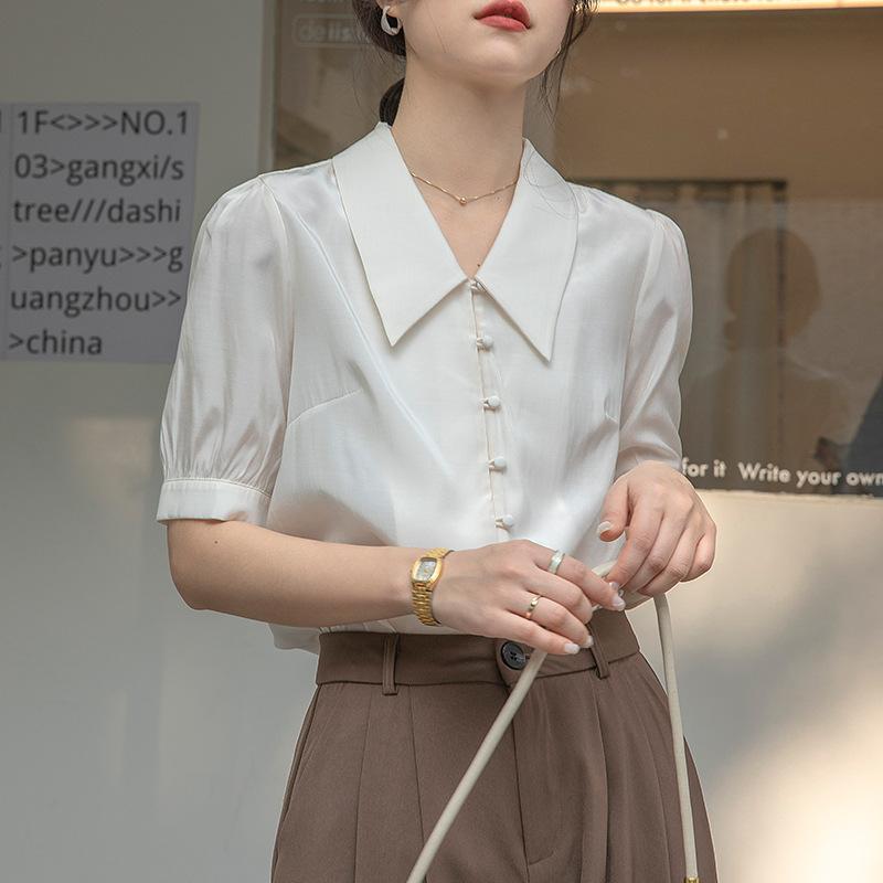 Элегантные женские рубашки, французская белая рубашка, женская рубашка с короткими рукавами, дизайн Sense Niche, атласная блузка с V-образным вырезом, летний темперамент, профессиональная рубашка для поездок на работу