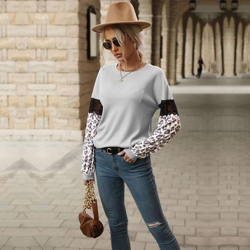 Топы Рубашки Одежда Модный и Повседневный Темперамент Осень и Зима Сращивание Топы Женщины Леопардовый Принт Длинный Рукав Контрастный Цвет Вязаная Рубашка