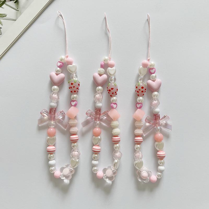 Сладкий и милый розовый клубничный мобильный ремешок, цепочки для телефона для женщин, жемчужная цепочка, подвеска-шарм для телефона, брелок, шнурок от потери, украшения
