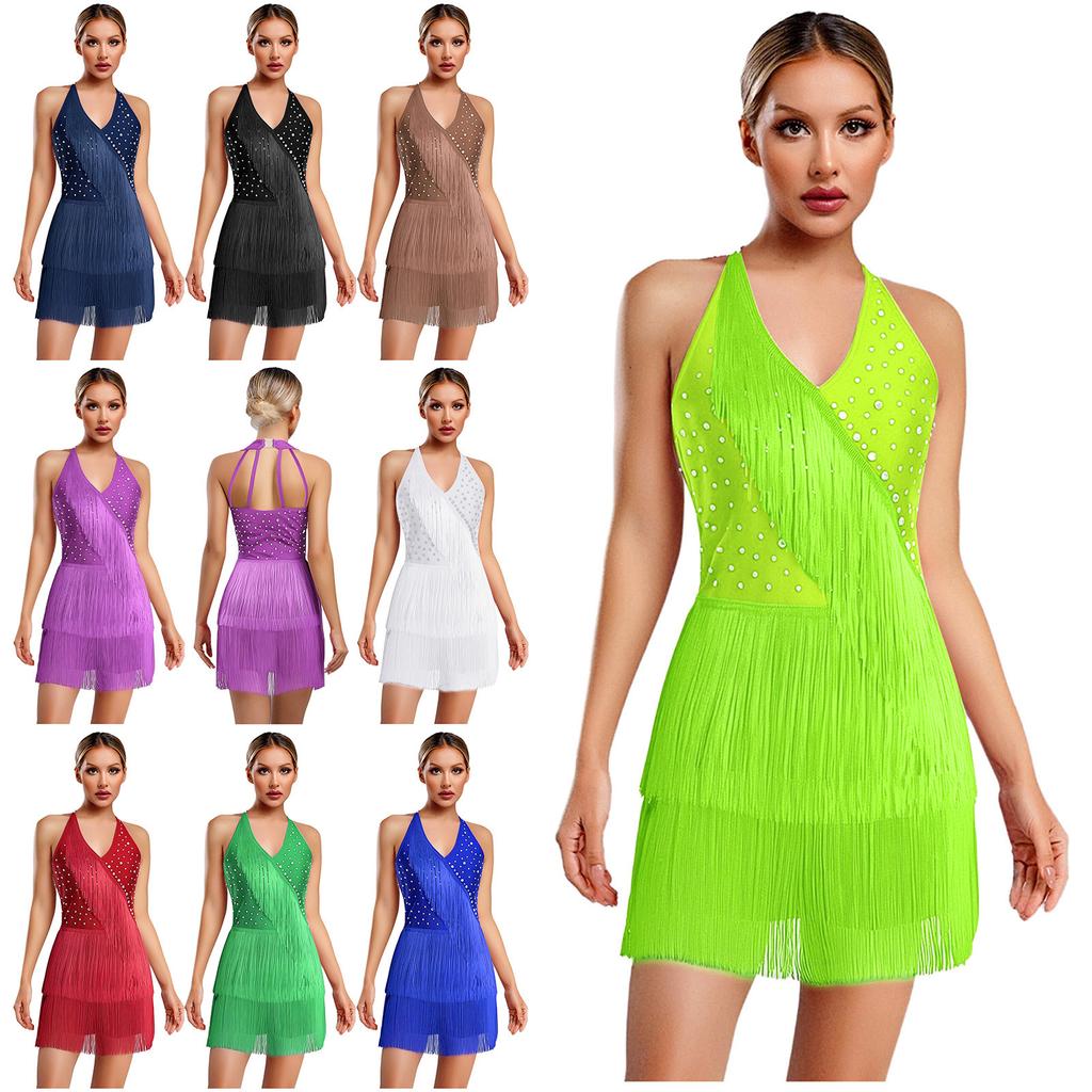 Женский костюм для латиноамериканских танцев Комбинезон с халтером и стразами Многослойная бахрома Спинка со шнуровкой S-3XL Леотард