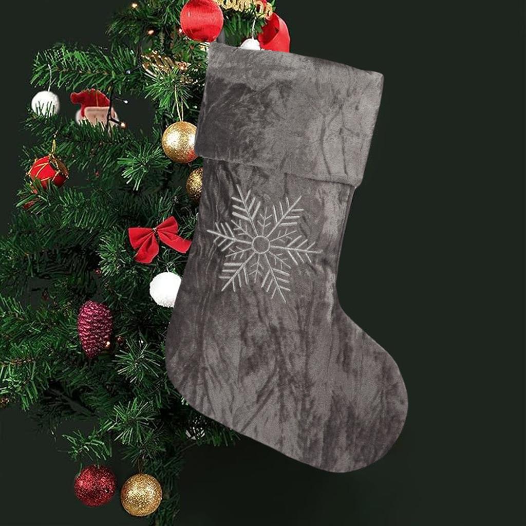 Christmas Decorations Snowflake Christmas Stockings High-end Christmas Stockings Christmas Tree Decorations Design: This high-end Christmas snowflake stocking blends luxurious elegance with festive charm, making it the perfect addition to your Christmas tree or mantel. The stocking is crafted from premium materials and features an intricate snowflake pattern, interspersed with hand-embroidered snowflakes for added dimension. Ribbed cuffs the top edge, making it easy to hang from Christmas tree branches or mantel hooks.