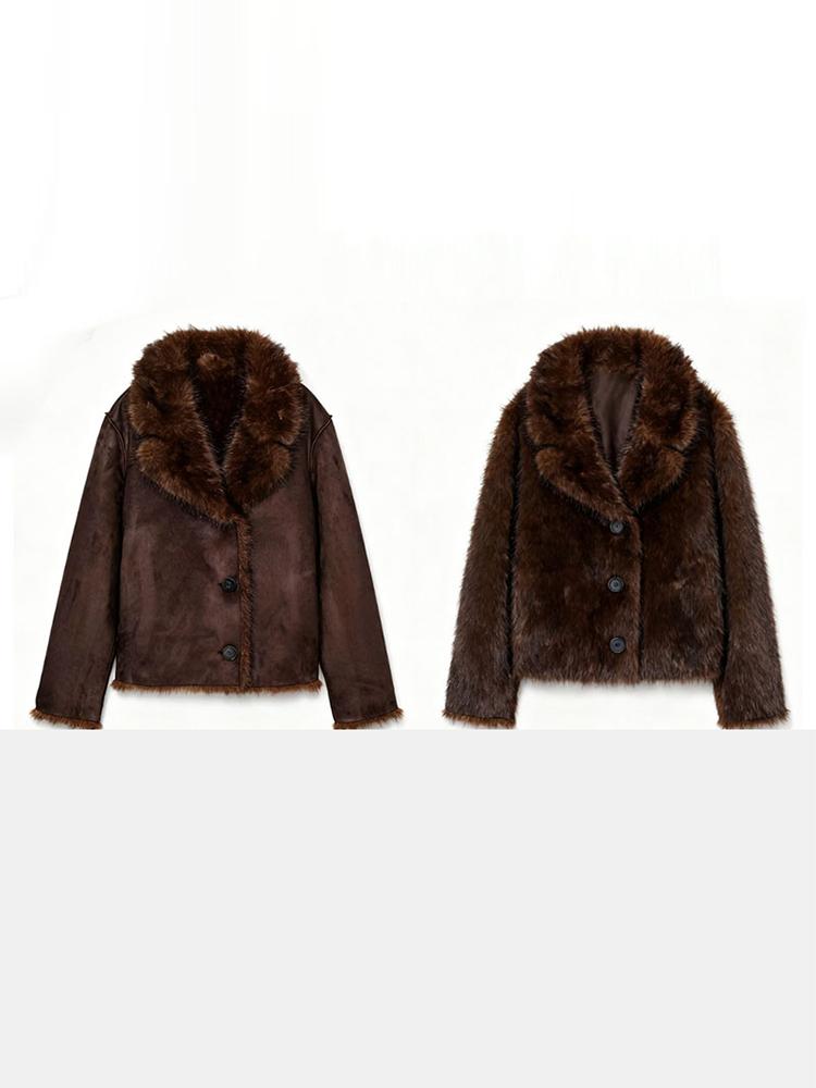 Женская двусторонняя зимняя куртка Женская замшевая куртка из искусственного меха Женский теплый топ на пуговицах с воротником Коричневая Осень и Зима