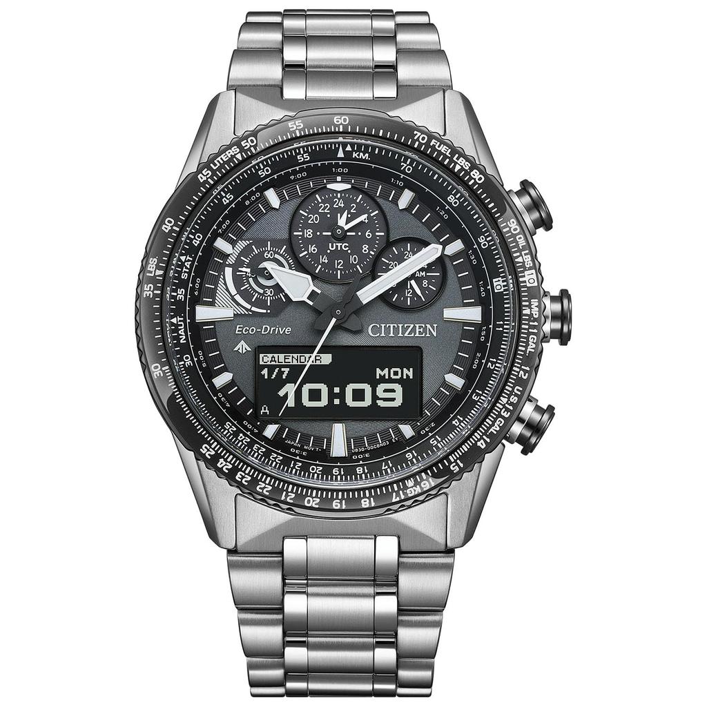 [Аналогово-цифровой гибрид] ЖК-дисплей MIP высокого разрешения расположен в положении «6 часов», обеспечивая безошибочную индикацию времени, многоязычную индикацию даты, секундомер и будильник, который можно установить на каждый день недели, и все это благодаря технологии Eco-Drive. Часы оснащены авиационной логарифмической линейкой на безеле, которую можно использовать для широкого спектра целей, включая преобразование единиц измерения и расчеты валютных курсов.. Гладкие, слегка узкие индексы и безель создают интеллектуальное впечатление.. Эта модель, с ее уникальной привлекательностью, сочетающей точность и мощь, открывает новые возможности для аналоговых часов.