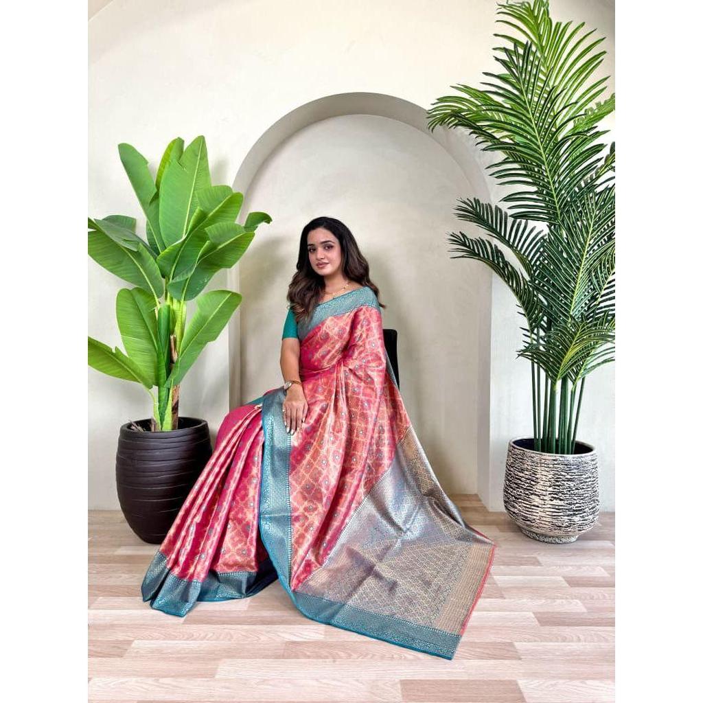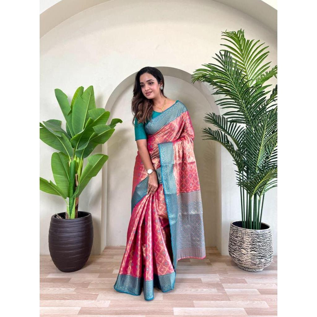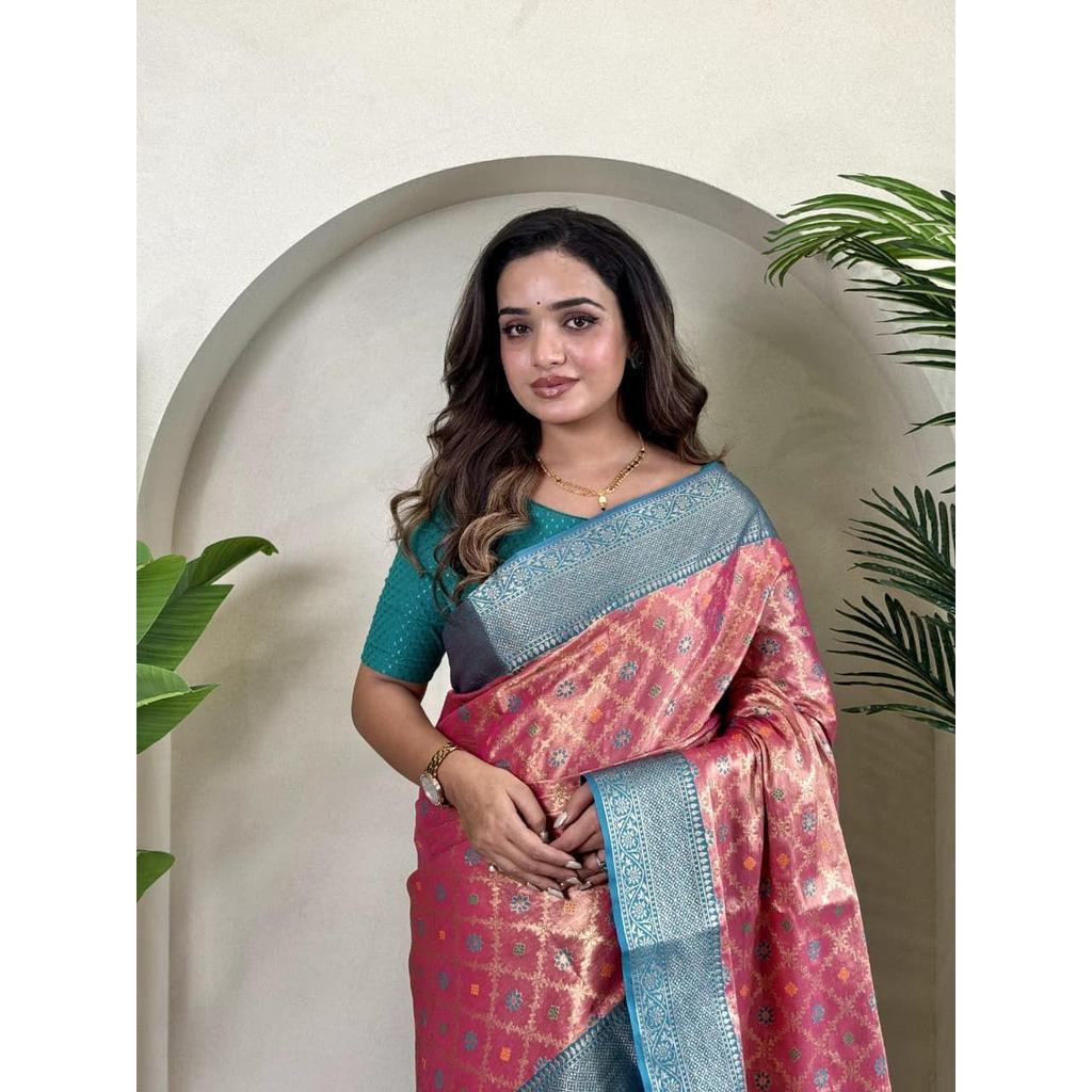 2)Ткань сари : сари из чистого тканого шелка с вышивкой зари и мина-работой, с блузкой в тон и элегантным узором джаль по всему полотну.