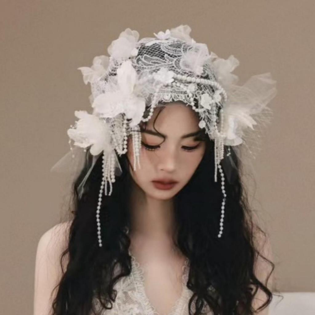 Французское кружево, цветочное, с бисером, свадебная шляпка-вуаль для фотосессий и свадеб