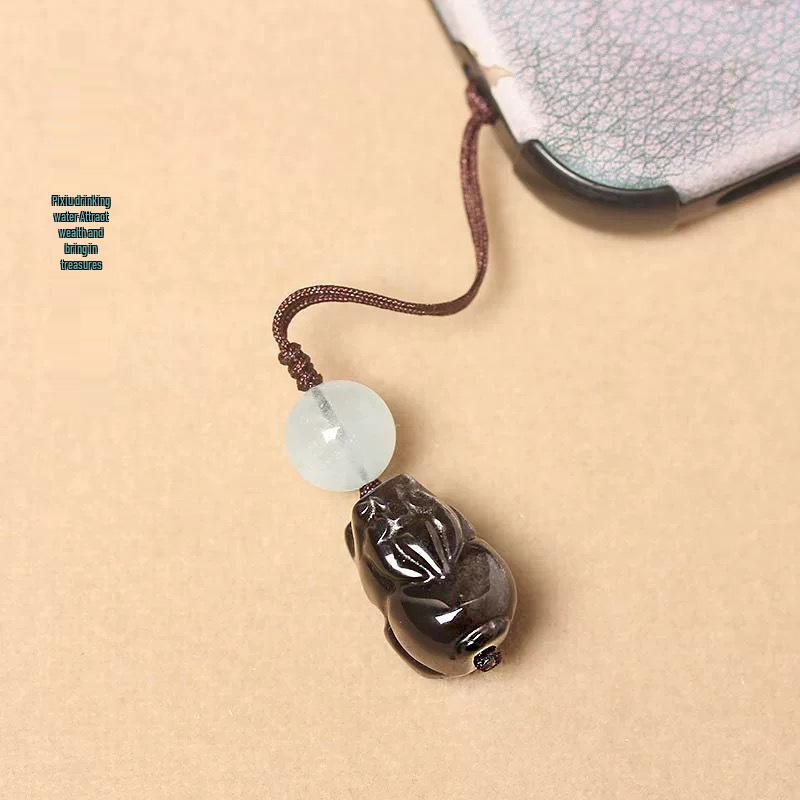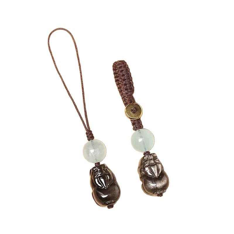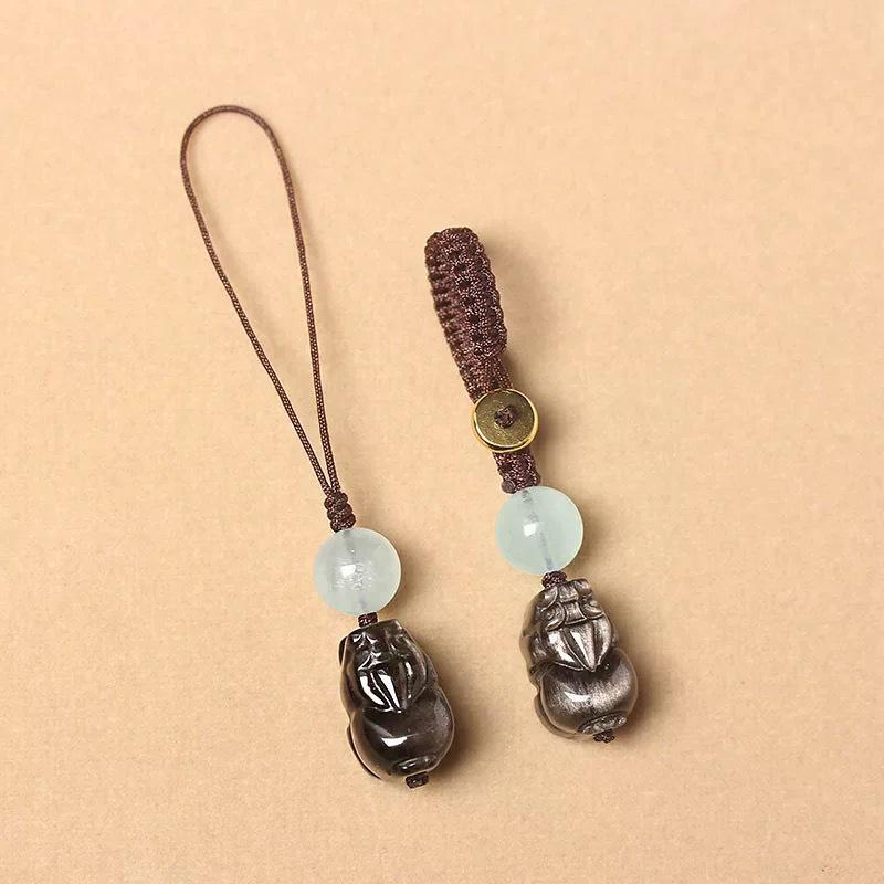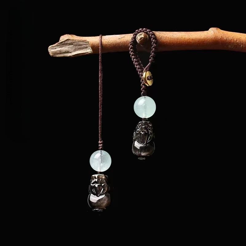 Серебристый Обсидиан и Голубой Халцедон Брелок-шнурок Пи Сю - Унисекс Подвеска для Автомобиля и Телефона