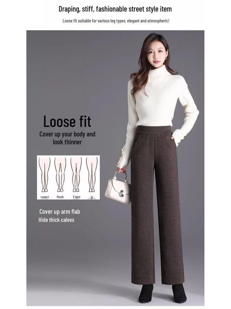 Почувствуйте комфорт и стиль в этих женских шерстяных брюках больших размеров с высокой посадкой и бархатной подкладкой.. Идеальные для холодных осенних и зимних месяцев, эти брюки изготовлены из шерсти премиум-класса, обеспечивающей тепло и уют.. Высокая линия талии обеспечивает облегающий и стройнящий силуэт, а свободный крой обеспечивает свободу движений и создает непринужденный повседневный стиль.. Идеальные как для повседневных прогулок, так и для более расслабленной обстановки, эти брюки сочетают в себе практичность и изысканную моду для современной женщины.