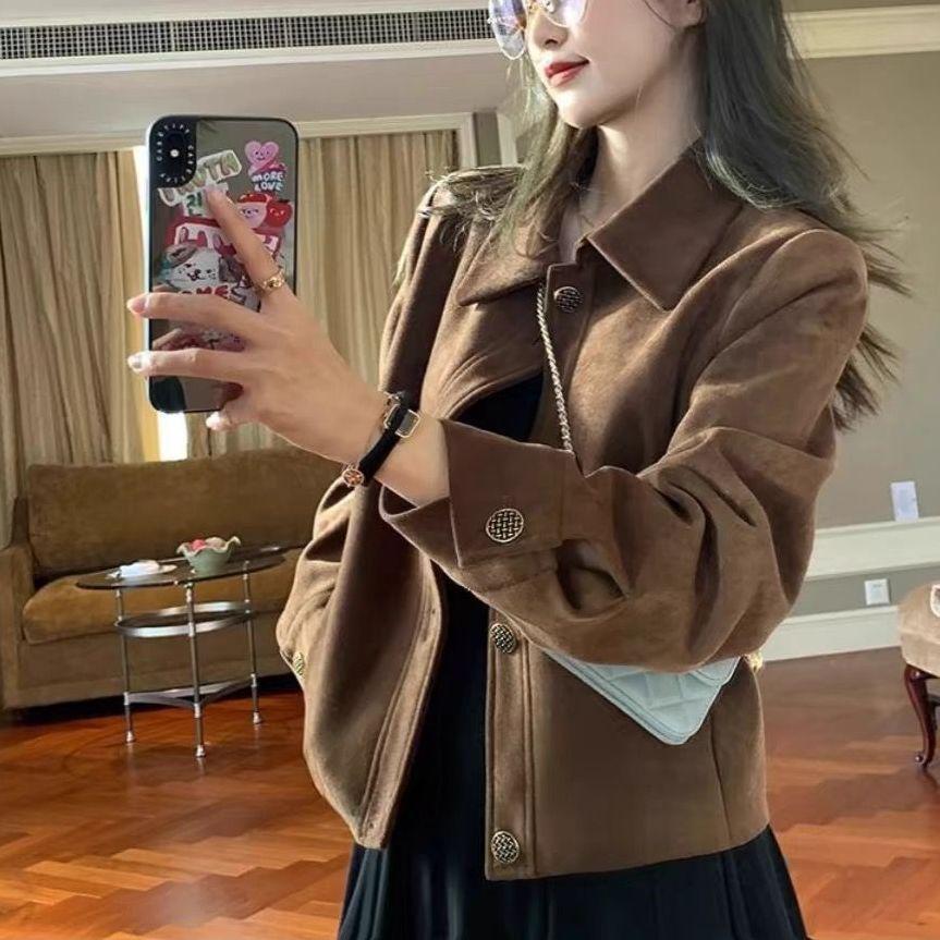 Женская короткая куртка из хаки замши - Весна/Осень 2025, корейский свободный ретро-стиль для миниатюрных — купить товар онлайн с бесплатной доставкой по всему миру!