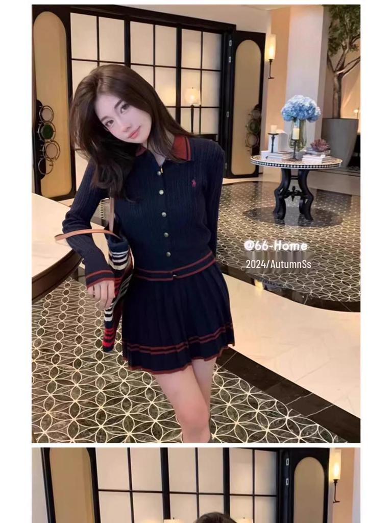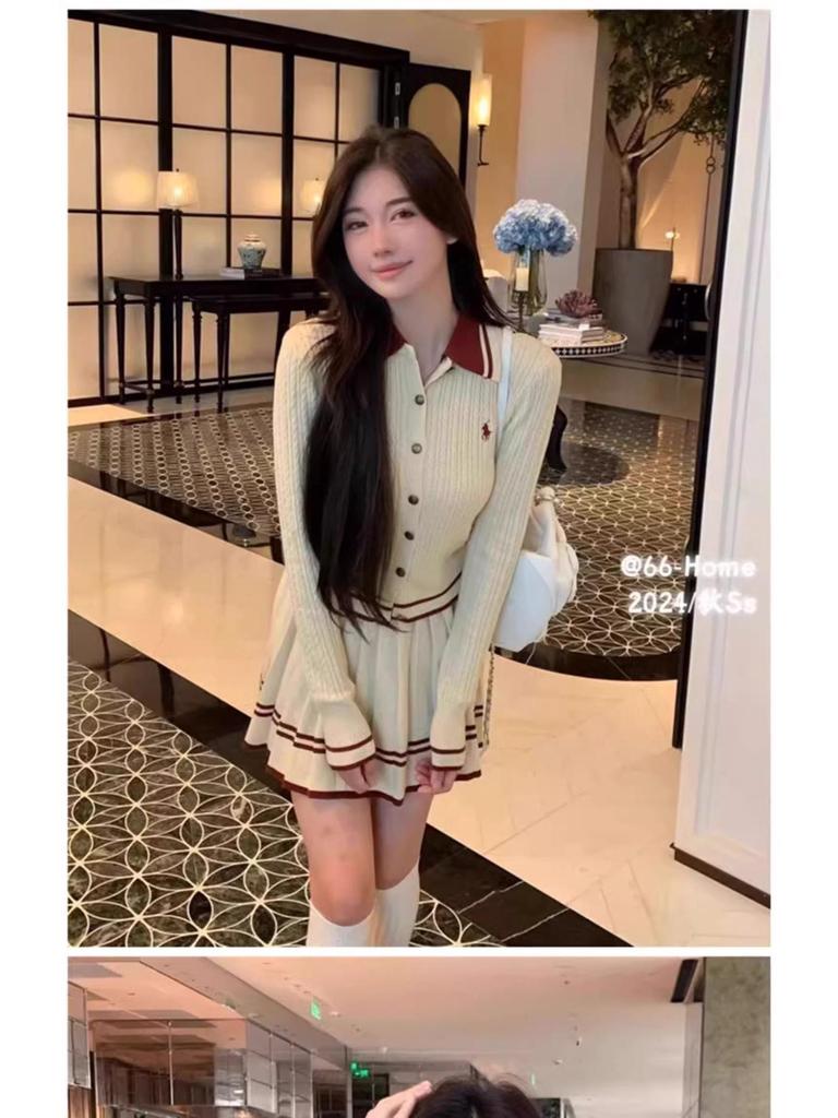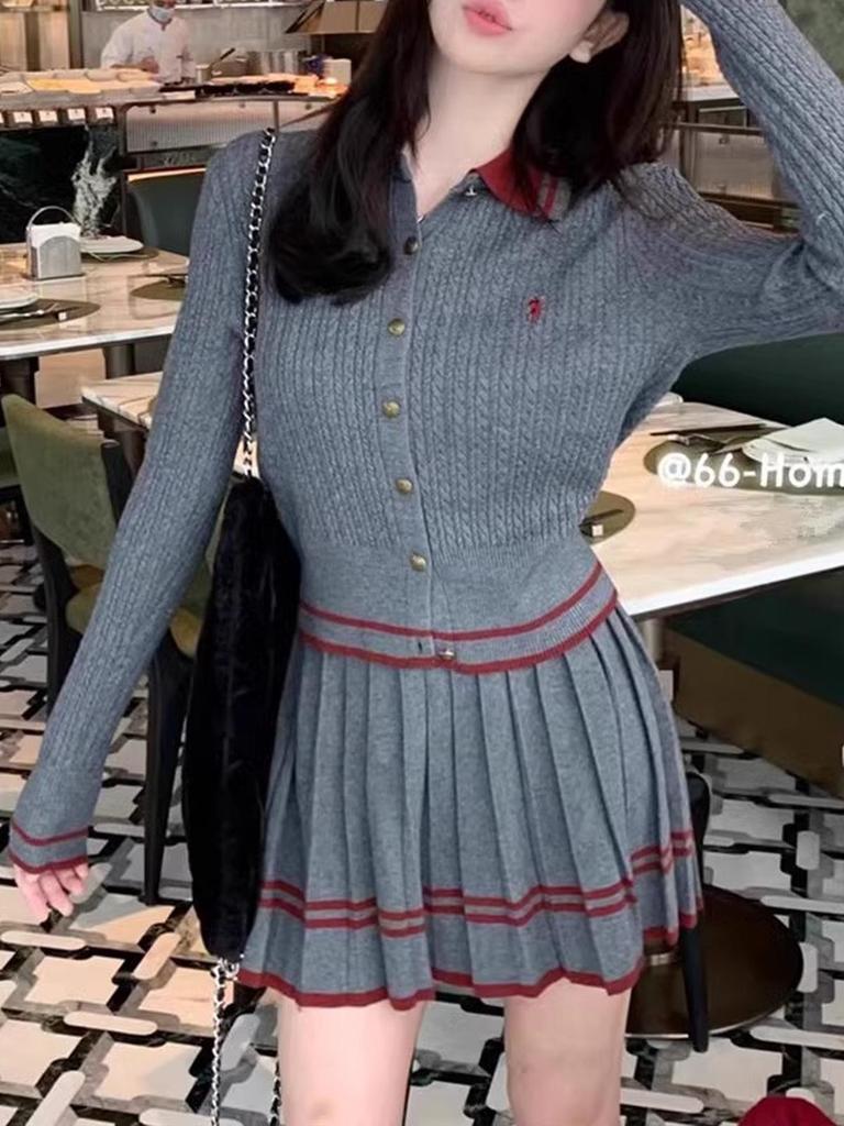 Преппи Комплект из двух частей: вязаный кардиган и плиссированная юбка с воротником поло