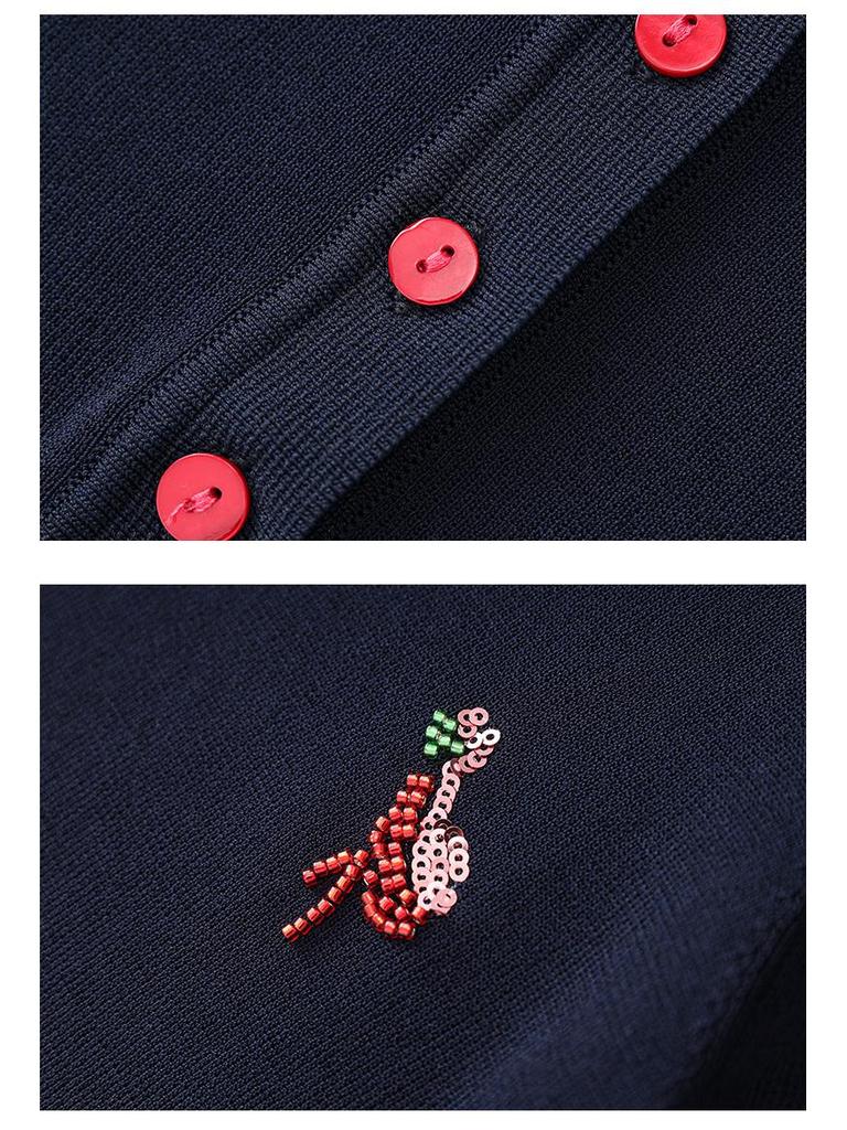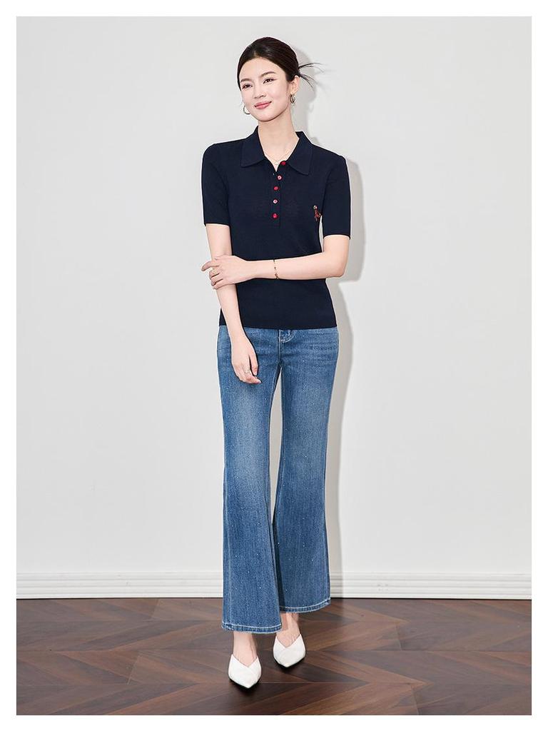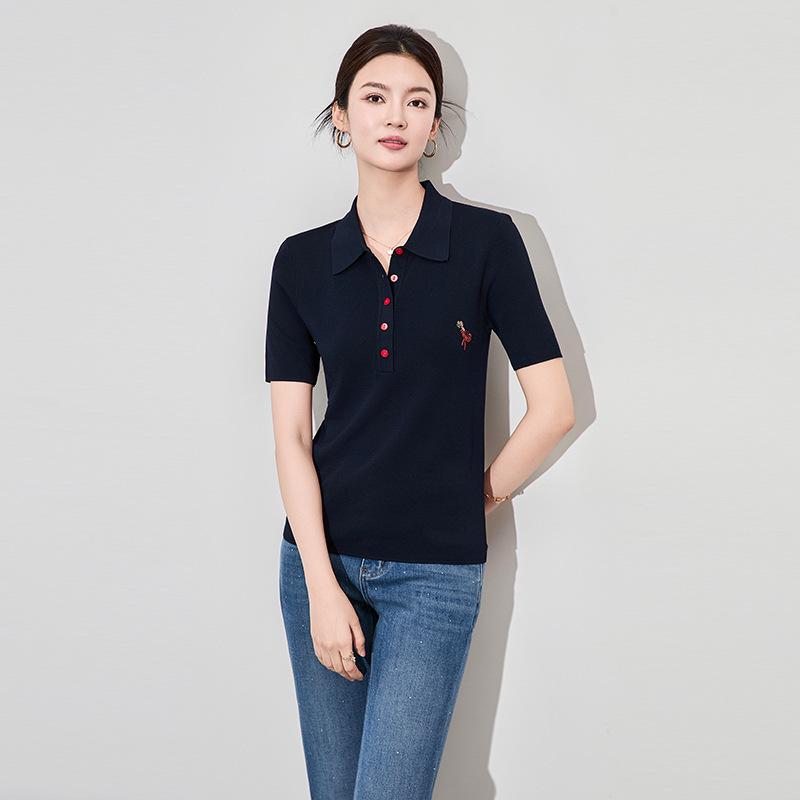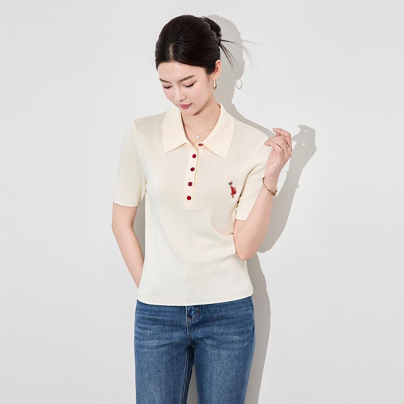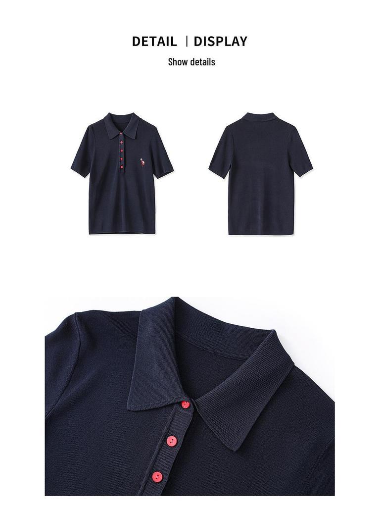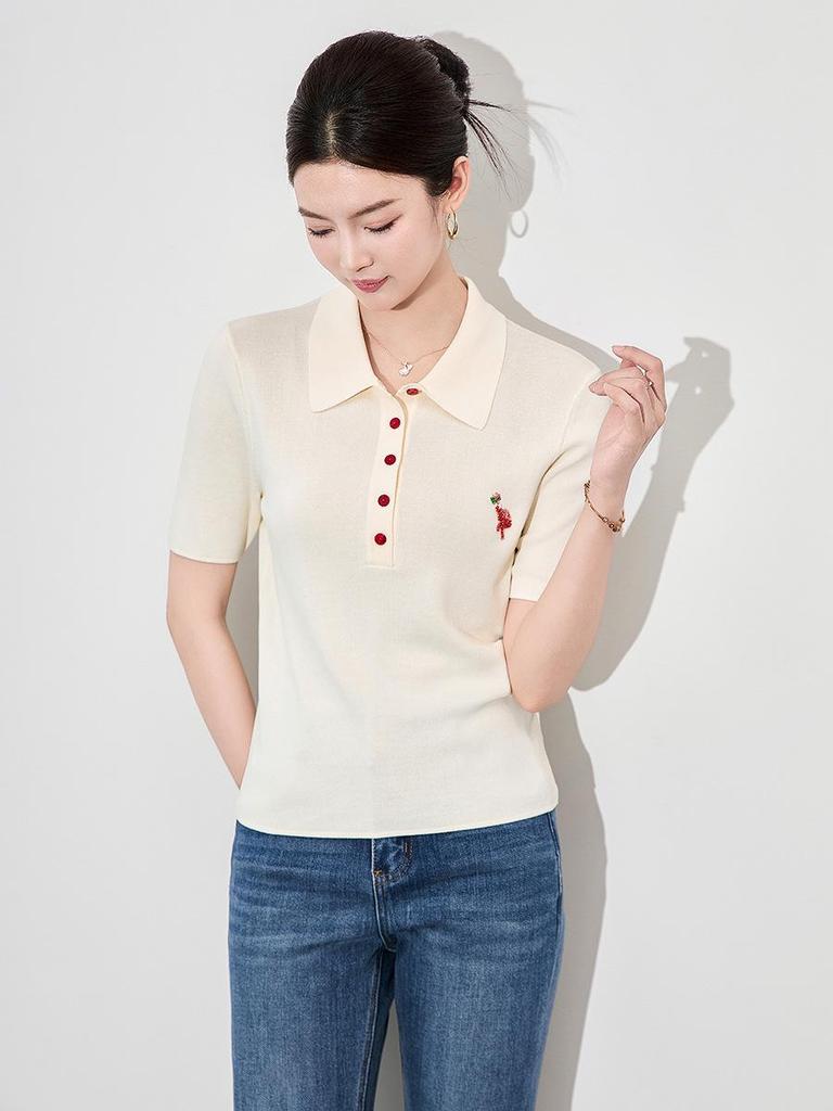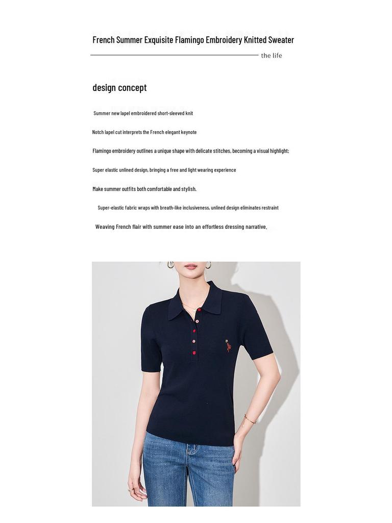 Изысканный вязаный топ с отложным воротником и вышивкой фламинго во французском стиле для женщин - Новая летняя мода с коротким рукавом