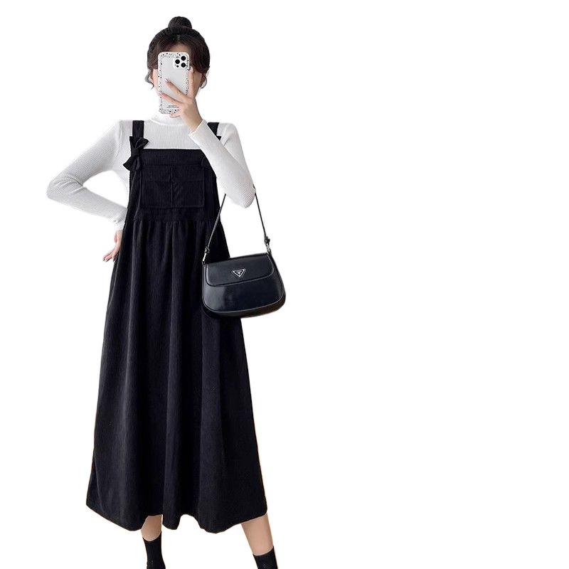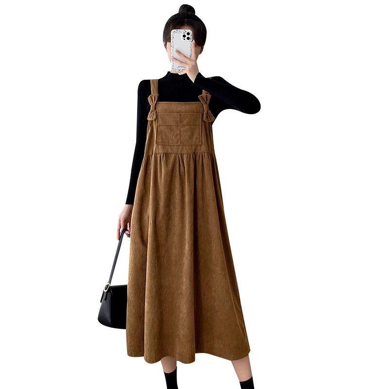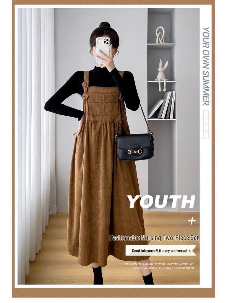 Комплект вельветового платья-сарафана для беременных больших размеров – Стильный миди-комплект из двух вещей для осени/зимы