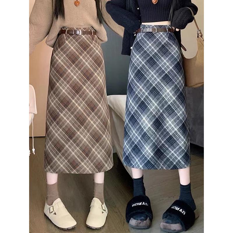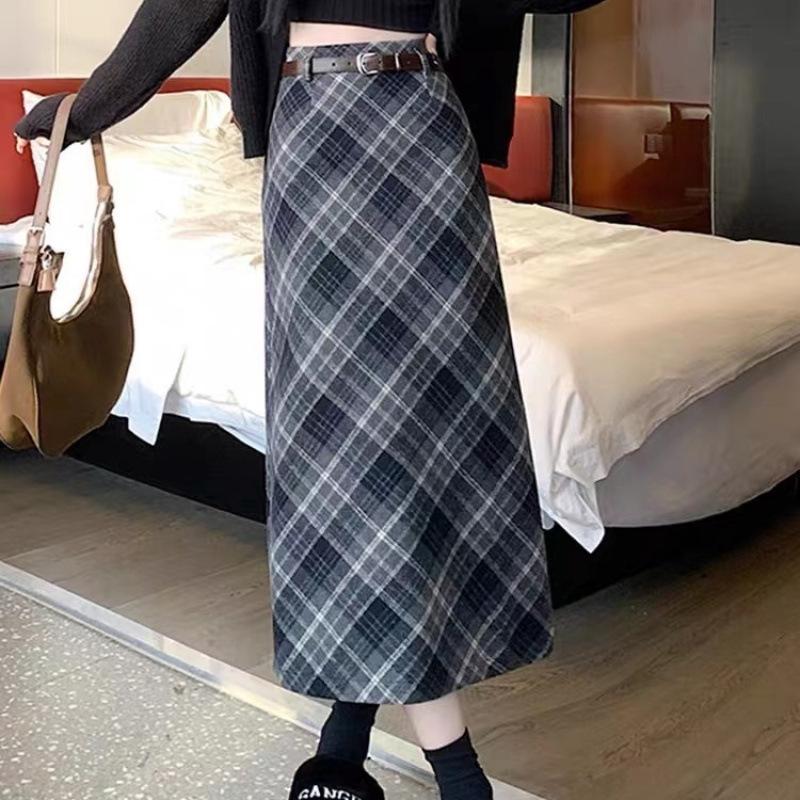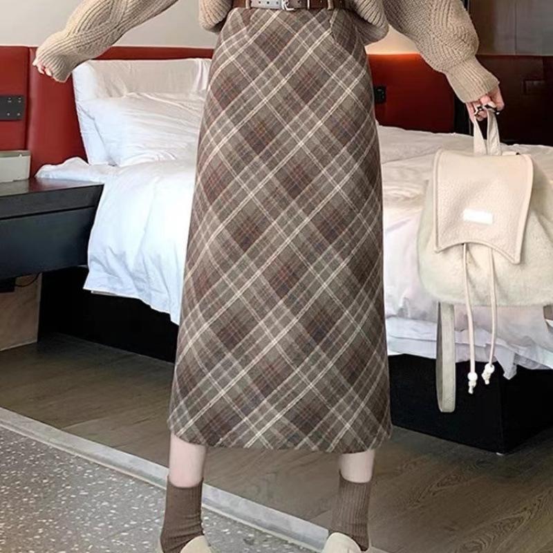 Клетчатая ретро шерстяная миди-юбка: Юбка А-силуэта с высокой талией и разрезом, приталенная миди-длина для осени/зимы 2023