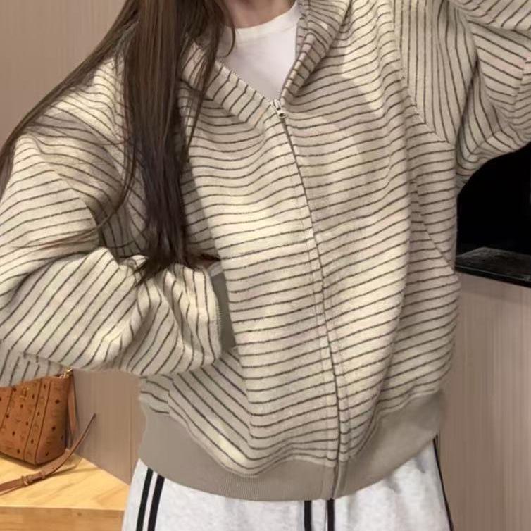 Женская куртка-кардиган на молнии с капюшоном в полоску, ранний осенний стиль - Нишевый ленивый стиль, Повседневная свободная кофта — купить товар онлайн с бесплатной доставкой по всему миру!