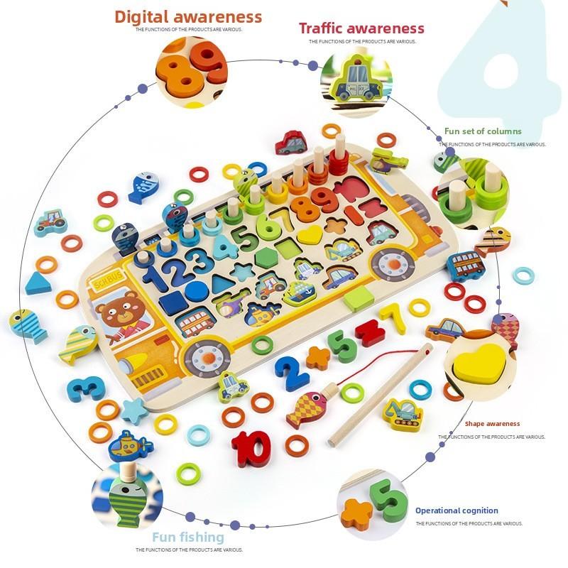 This multi-functional children's math and log table features a bus and fishing shape, designed to enhance early learning. Made of durable wood, it measures approximately 8 inches in length, supporting educational play. Ideal for classroom or home use, it encourages problem-solving and fine motor skills. Wipe clean with a damp cloth.