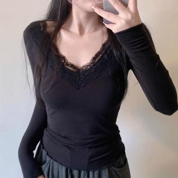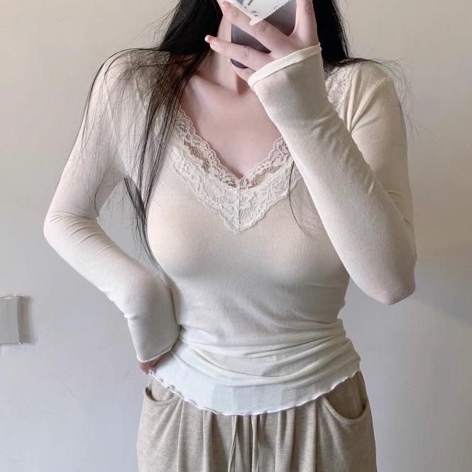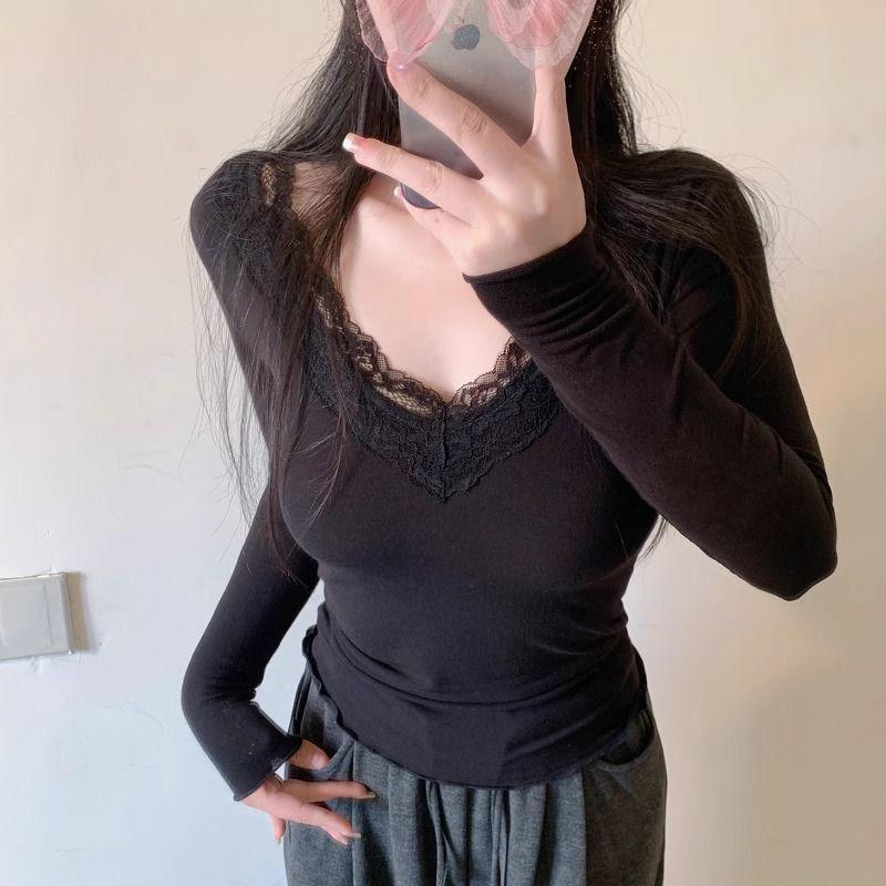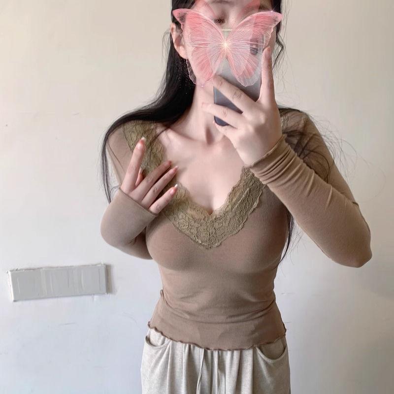Женский облегающий кружевной кроп-топ с длинным рукавом – стиль Pure Desire, базовый слой для весны/осени